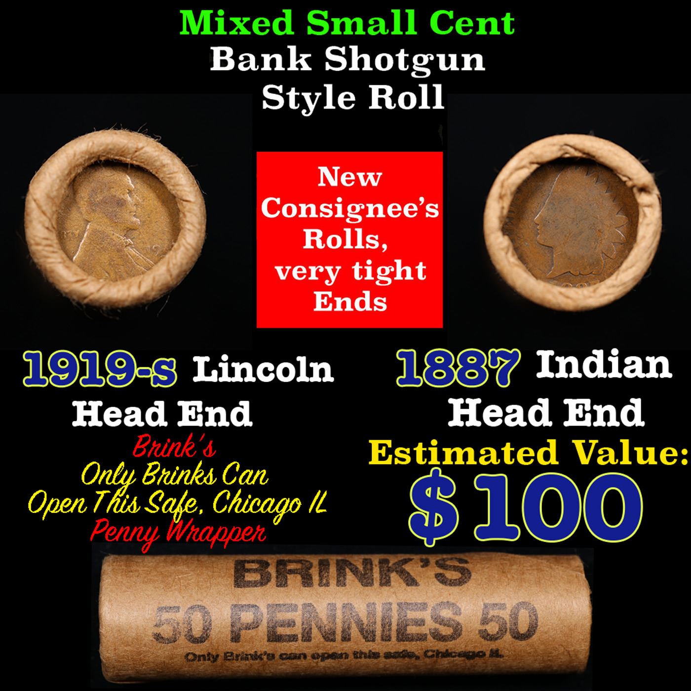 Mixed small cents 1c orig shotgun roll, 1919-s Wheat Cent, 1887 Indian Cent other end, Brinks Wrapper.. The roll is held in an old Rare & Collectable Brinks 'Only Brinks Can Open This Safe, Chicago IL' Penny wrapper. Actual roll pictured is the roll you will get. A great original bank shotgun roll with very tight ends. We have opened a few of these rolls. They seem to be mixed small cents including Indians, Wheats, Steel cents & some Flying Eagles mixed in. These shotgun rolls are all from a new consignee. They are all frrom one Estate.