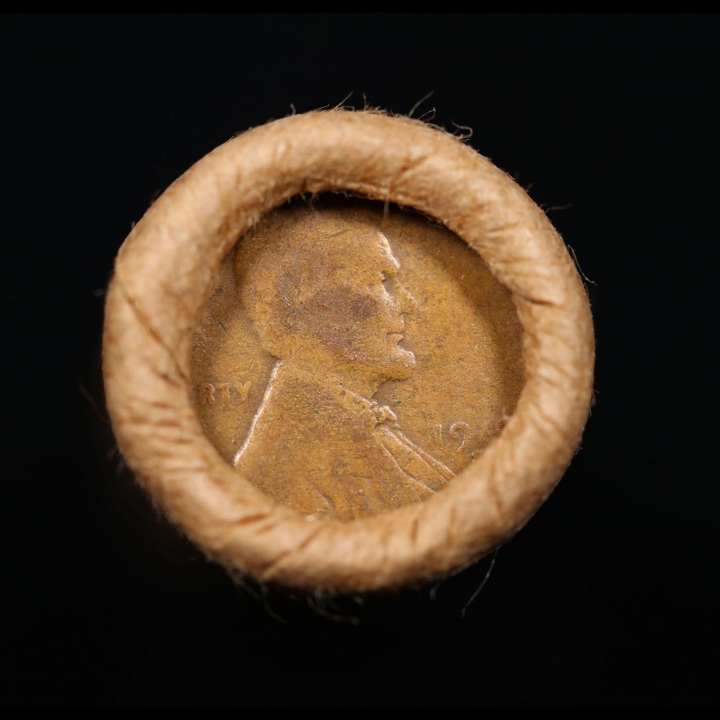 Mixed small cents 1c orig shotgun roll, 1919-s Wheat Cent, 1887 Indian Cent other end, Brinks Wrappe