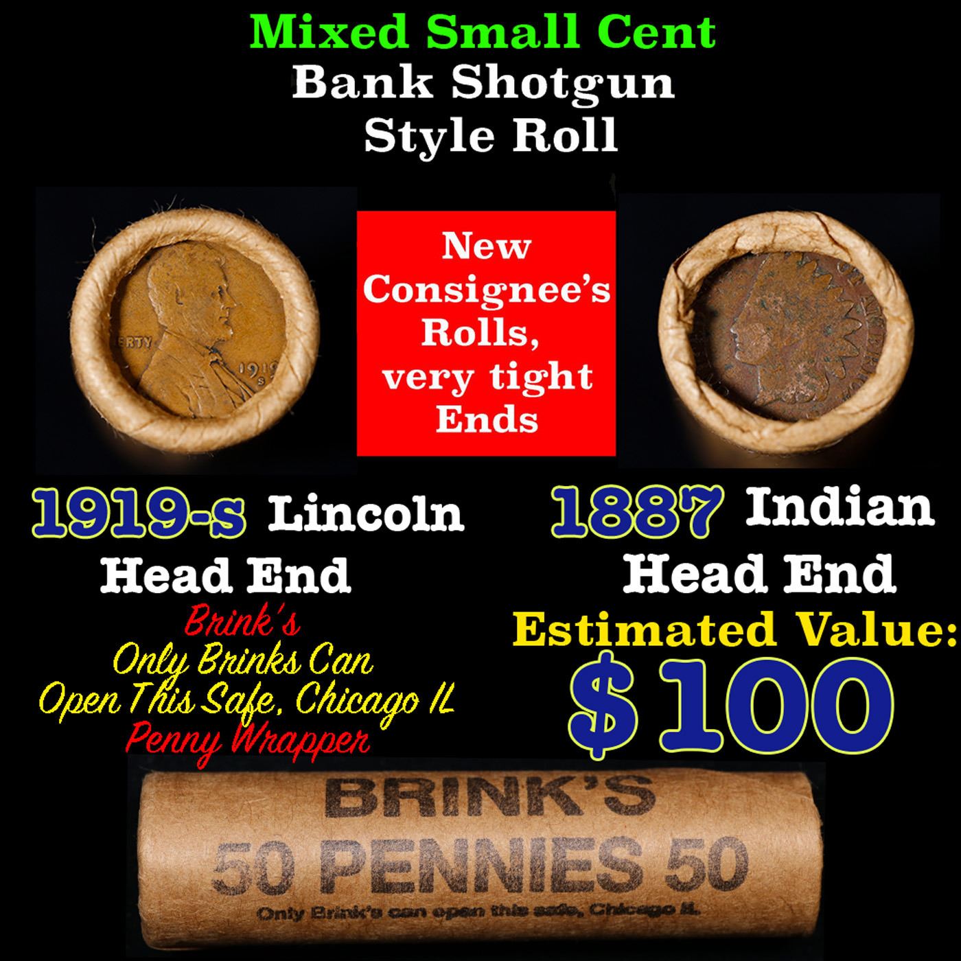 Mixed small cents 1c orig shotgun roll, 1919-s Wheat Cent, 1887 Indian Cent other end, Brinks Wrapper Grades. The roll is held in an old Rare & Collectable Brinks Wrapper. Actual roll pictured is the roll you will get. A great original bank shotgun roll with very tight ends. We have opened a few of these rolls. They seem to be mixed small cents including Indians, Wheats, Steel cents & some Flying Eagles mixed in. These shotgun rolls are all from a new consignee. They are all frrom one Estate.