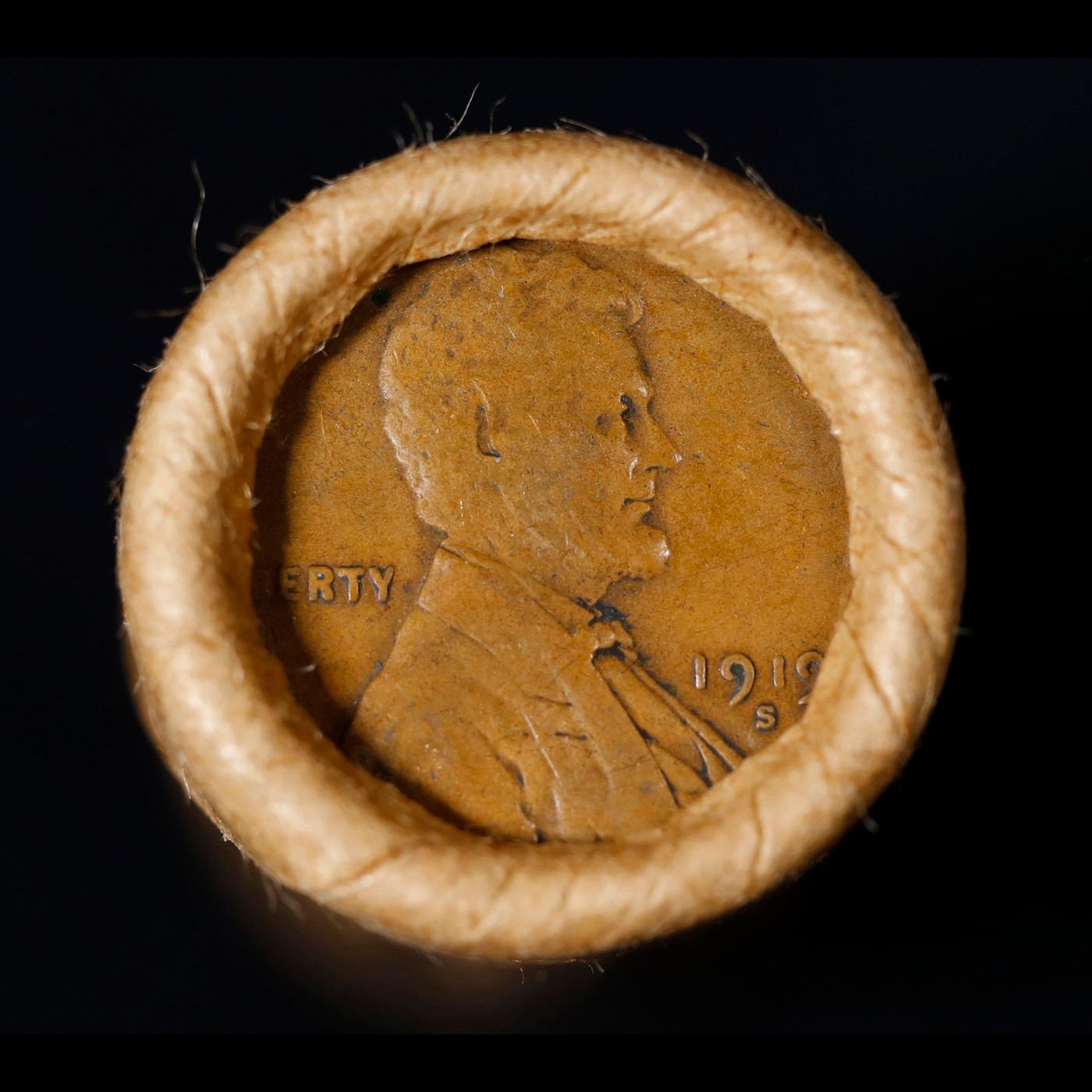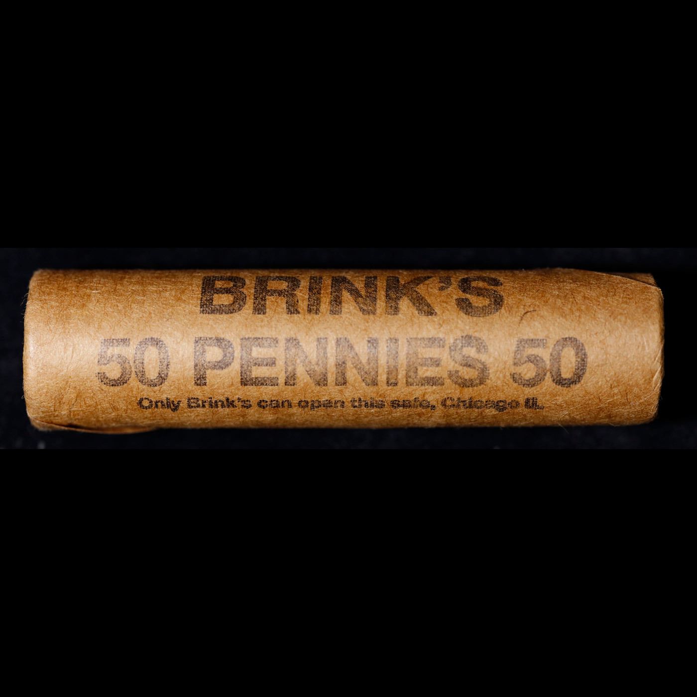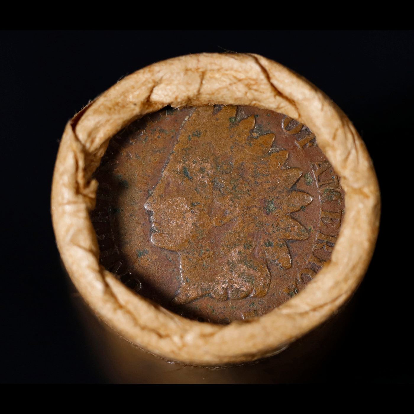 Mixed small cents 1c orig shotgun roll, 1919-s Wheat Cent, 1887 Indian Cent other end, Brinks Wrappe