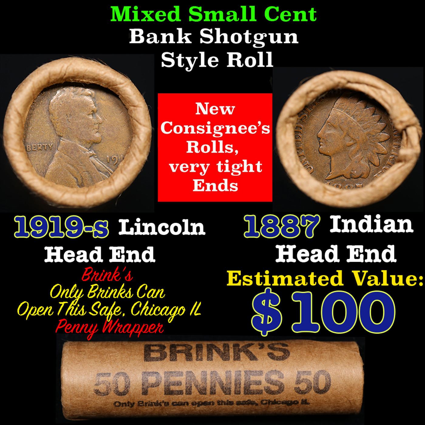 Mixed small cents 1c orig shotgun roll, 1919-s Wheat Cent, 1887 Indian Cent other end, Brinks Wrapper.. The roll is held in an old Rare & Collectable Brinks 'Only Brinks Can Open This Safe, Chicago IL' Penny wrapper. Actual roll pictured is the roll you will get. A great original bank shotgun roll with very tight ends. We have opened a few of these rolls. They seem to be mixed small cents including Indians, Wheats, Steel cents & some Flying Eagles mixed in. These shotgun rolls are all from a new consignee. They are all frrom one Estate.