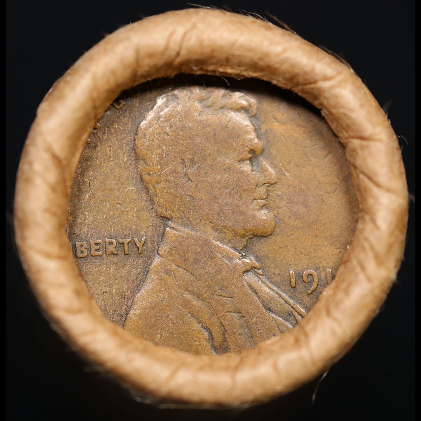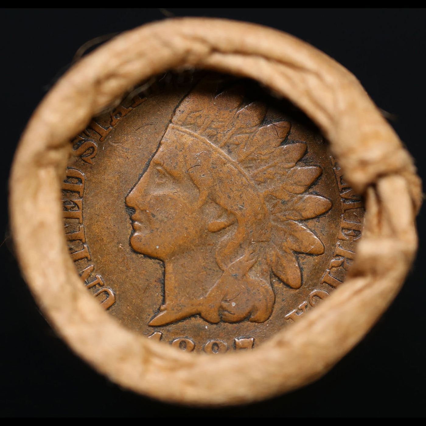 Mixed small cents 1c orig shotgun roll, 1919-s Wheat Cent, 1887 Indian Cent other end, Brinks Wrappe