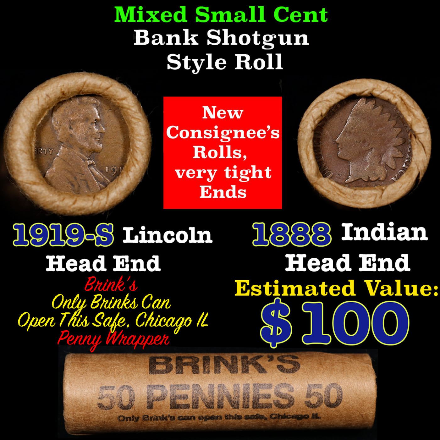 Mixed small cents 1c orig shotgun roll, 1919-s Wheat Cent, 1888 Indian Cent other end, Brinks Wrapper. The roll is held in an old Rare & Collectable Brinks Wrapper. Actual roll pictured is the roll you will get. A great original bank shotgun roll with very tight ends. We have opened a few of these rolls. They seem to be mixed small cents including Indians, Wheats, Steel cents & some Flying Eagles mixed in. These shotgun rolls are all from a new consignee. They are all frrom one Estate.
