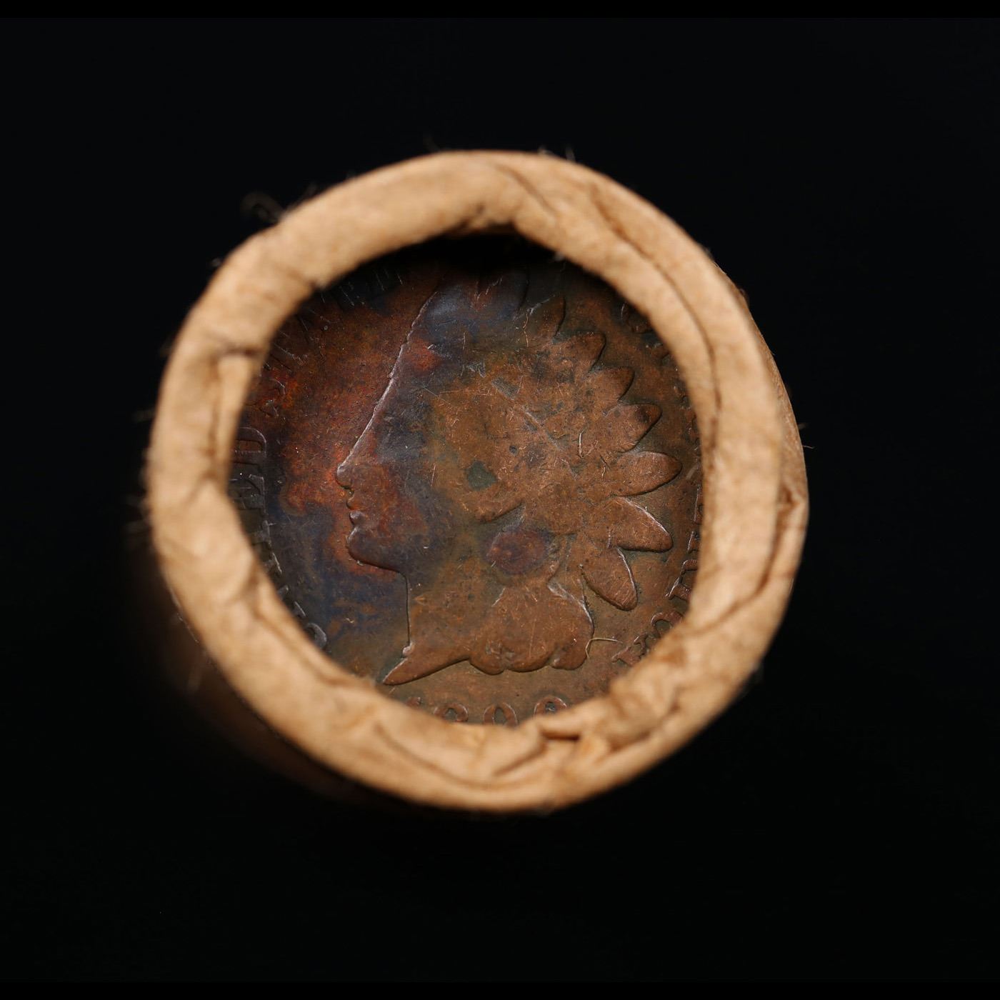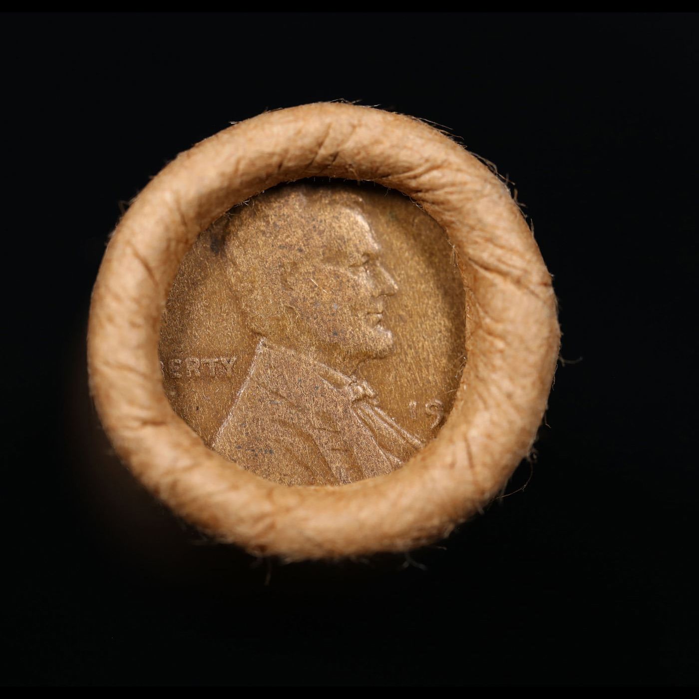Mixed small cents 1c orig shotgun roll, 1919-s Wheat Cent, 1890 Indian Cent other end, Brinks Wrappe