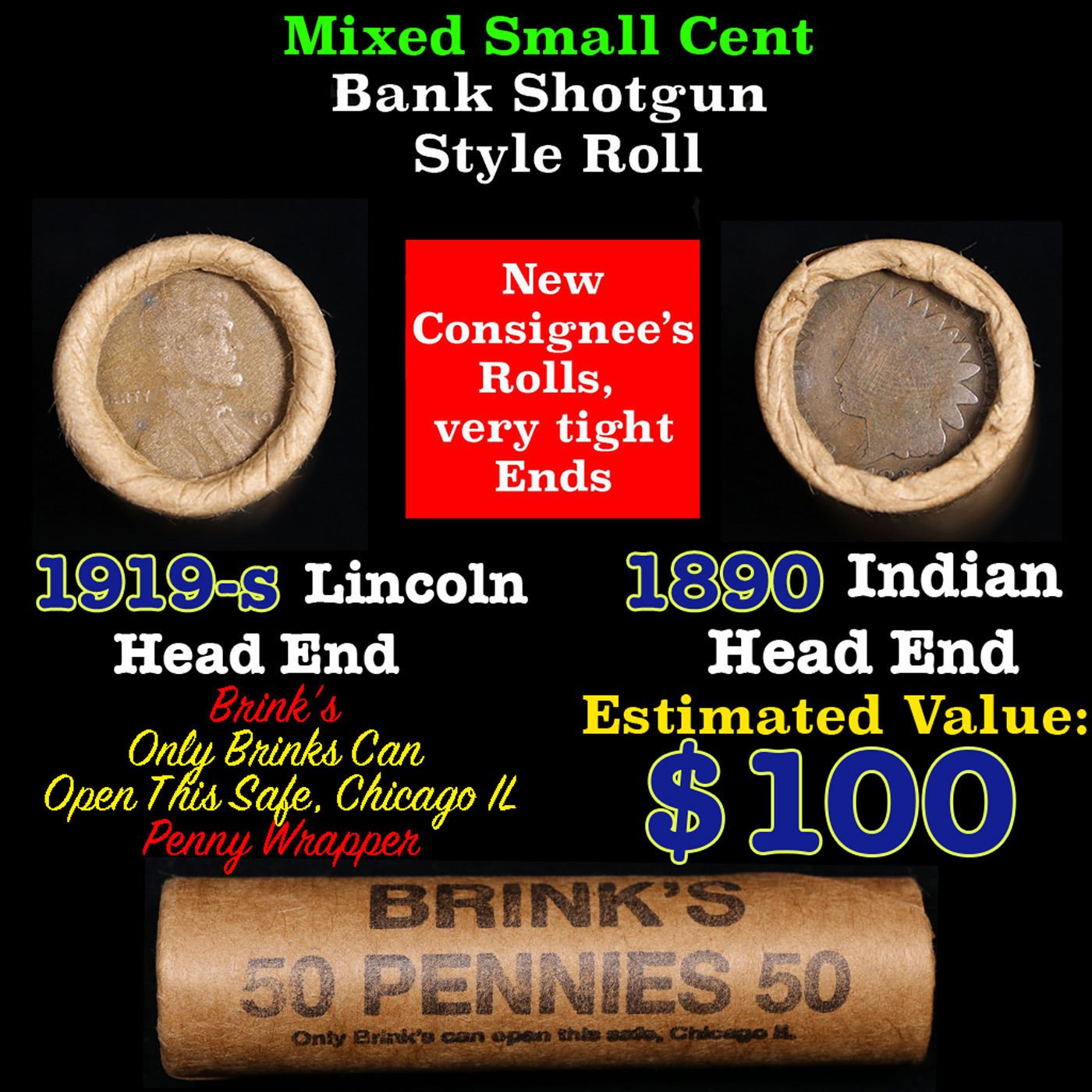 Mixed small cents 1c orig shotgun roll, 1919-s Wheat Cent, 1890 Indian Cent other end, Brinks Wrapper Grades. The roll is held in an old Rare & Collectable Brinks Wrapper. Actual roll pictured is the roll you will get. A great original bank shotgun roll with very tight ends. We have opened a few of these rolls. They seem to be mixed small cents including Indians, Wheats, Steel cents & some Flying Eagles mixed in. These shotgun rolls are all from a new consignee. They are all frrom one Estate.