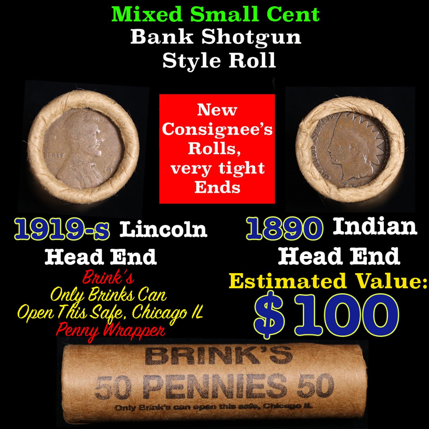 Mixed small cents 1c orig shotgun roll, 1919-s Wheat Cent, 1890 Indian Cent other end, Brinks Wrapper Grades. The roll is held in an old Rare & Collectable Brinks Wrapper. Actual roll pictured is the roll you will get. A great original bank shotgun roll with very tight ends. We have opened a few of these rolls. They seem to be mixed small cents including Indians, Wheats, Steel cents & some Flying Eagles mixed in. These shotgun rolls are all from a new consignee. They are all frrom one Estate.
