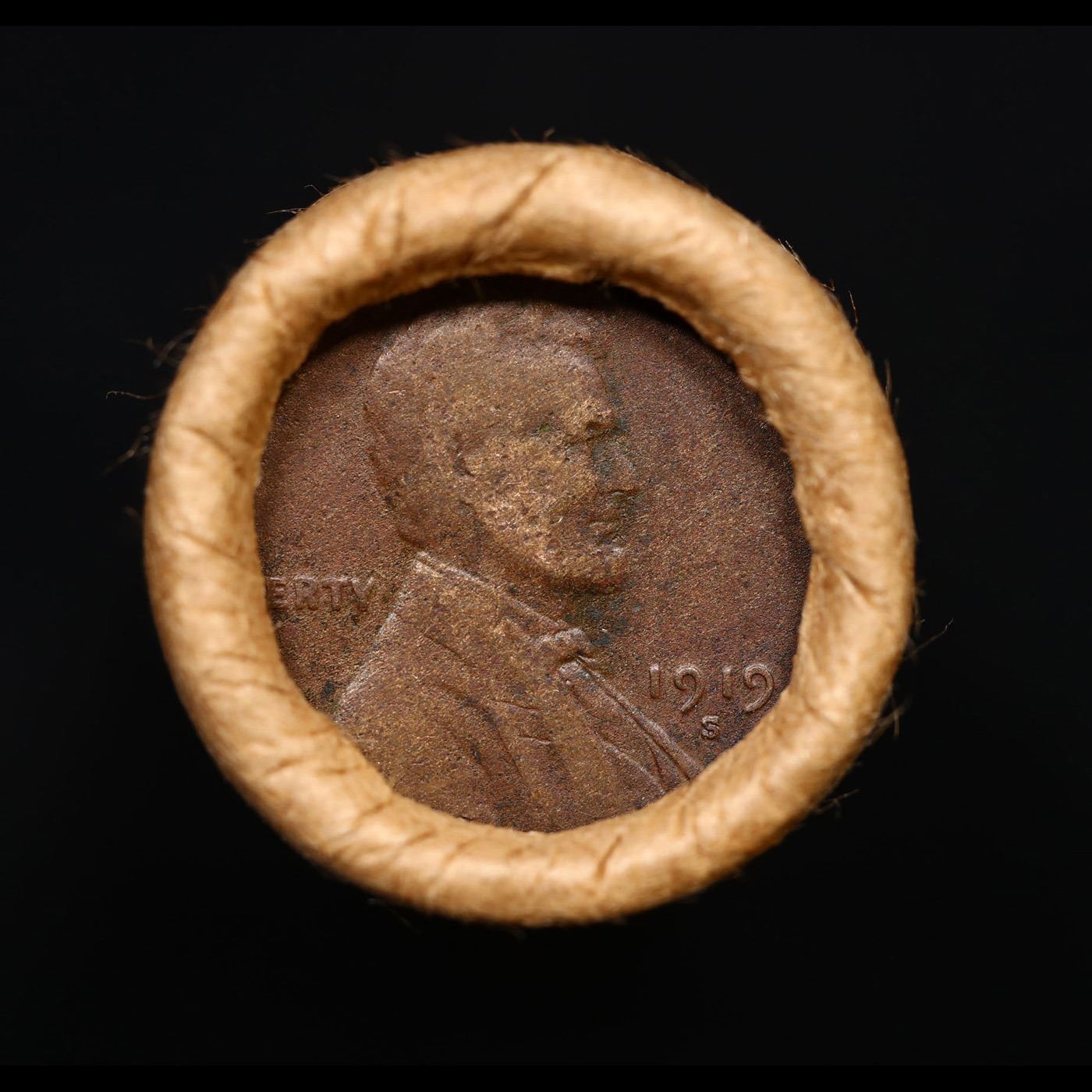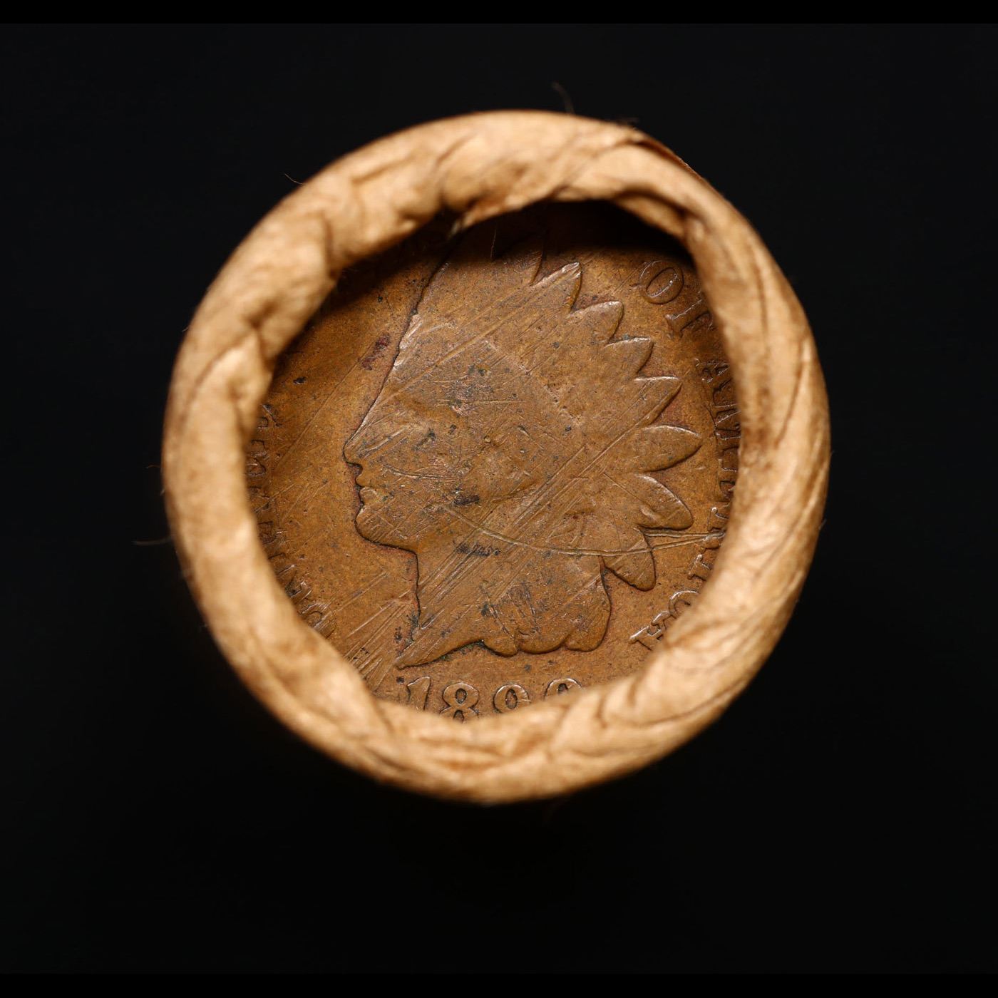 Mixed small cents 1c orig shotgun roll, 1919-s Wheat Cent, 1890 Indian Cent other end, Brinks Wrappe