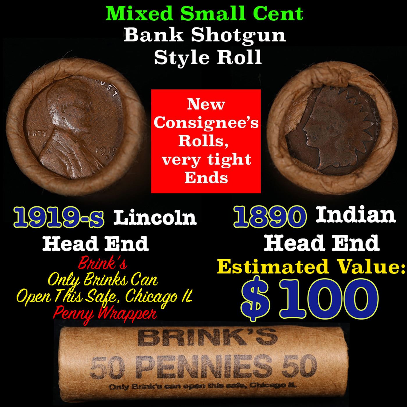 Mixed small cents 1c orig shotgun roll, 1919-s Wheat Cent, 1890 Indian Cent other end, Brinks Wrapper. The roll is held in an old Rare & Collectable Brinks Wrapper. Actual roll pictured is the roll you will get. A great original bank shotgun roll with very tight ends. We have opened a few of these rolls. They seem to be mixed small cents including Indians, Wheats, Steel cents & some Flying Eagles mixed in. These shotgun rolls are all from a new consignee. They are all frrom one Estate.