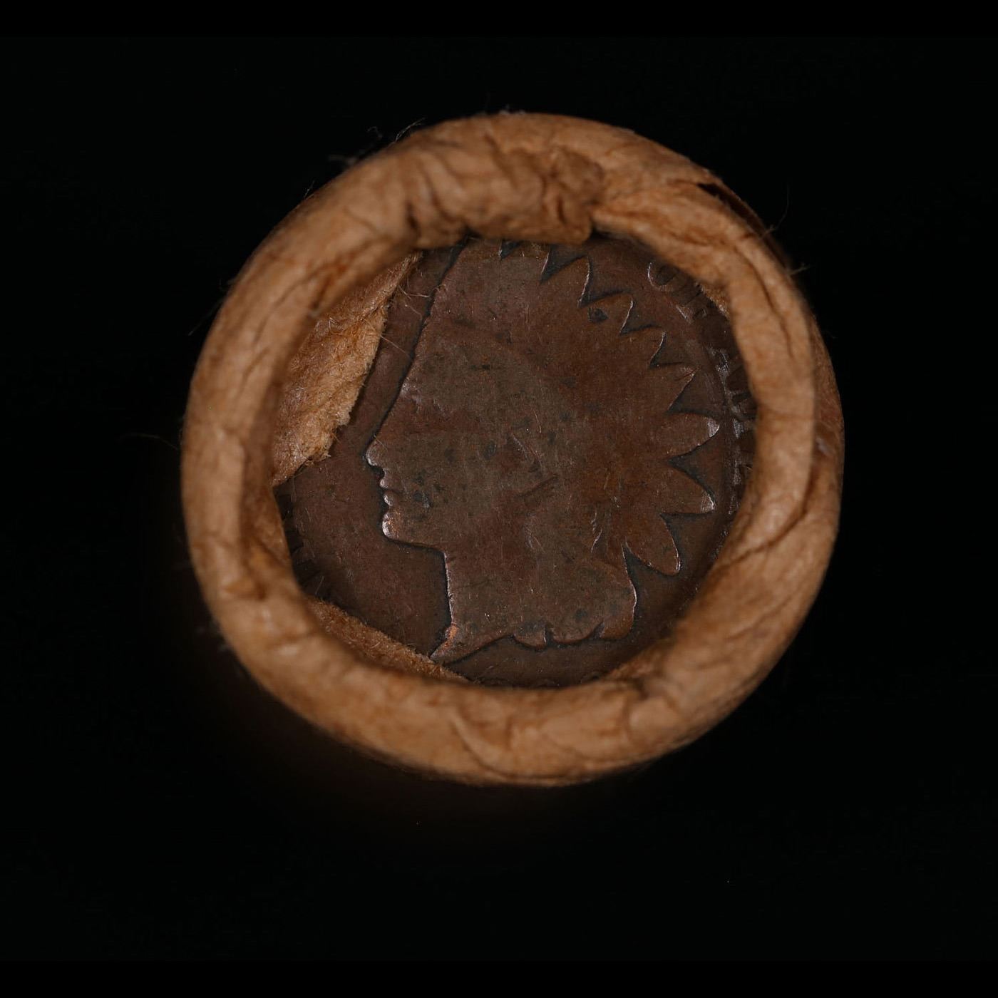 Mixed small cents 1c orig shotgun roll, 1919-s Wheat Cent, 1890 Indian Cent other end, Brinks Wrappe