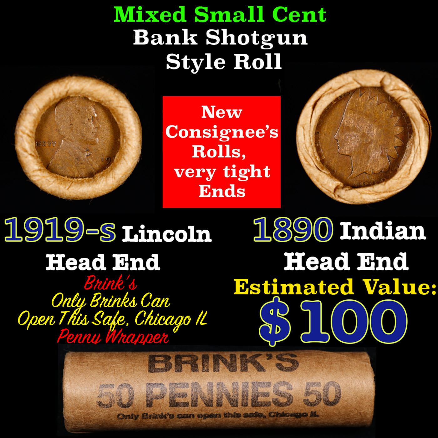 Mixed small cents 1c orig shotgun roll, 1919-s Wheat Cent, 1890 Indian Cent other end, Brinks Wrapper.. The roll is held in an old Rare & Collectable Brinks 'Only Brinks Can Open This Safe, Chicago IL' Penny wrapper. Actual roll pictured is the roll you will get. A great original bank shotgun roll with very tight ends. We have opened a few of these rolls. They seem to be mixed small cents including Indians, Wheats, Steel cents & some Flying Eagles mixed in. These shotgun rolls are all from a new consignee. They are all frrom one Estate.
