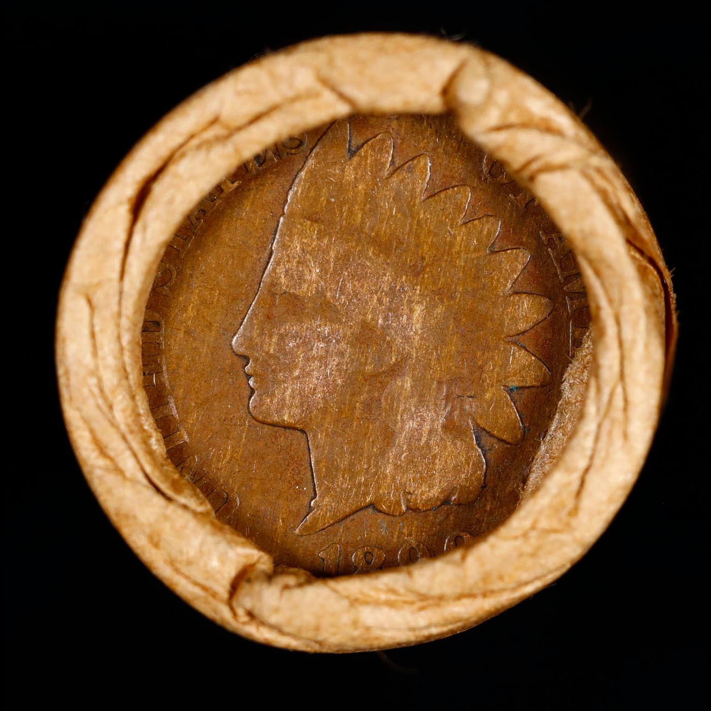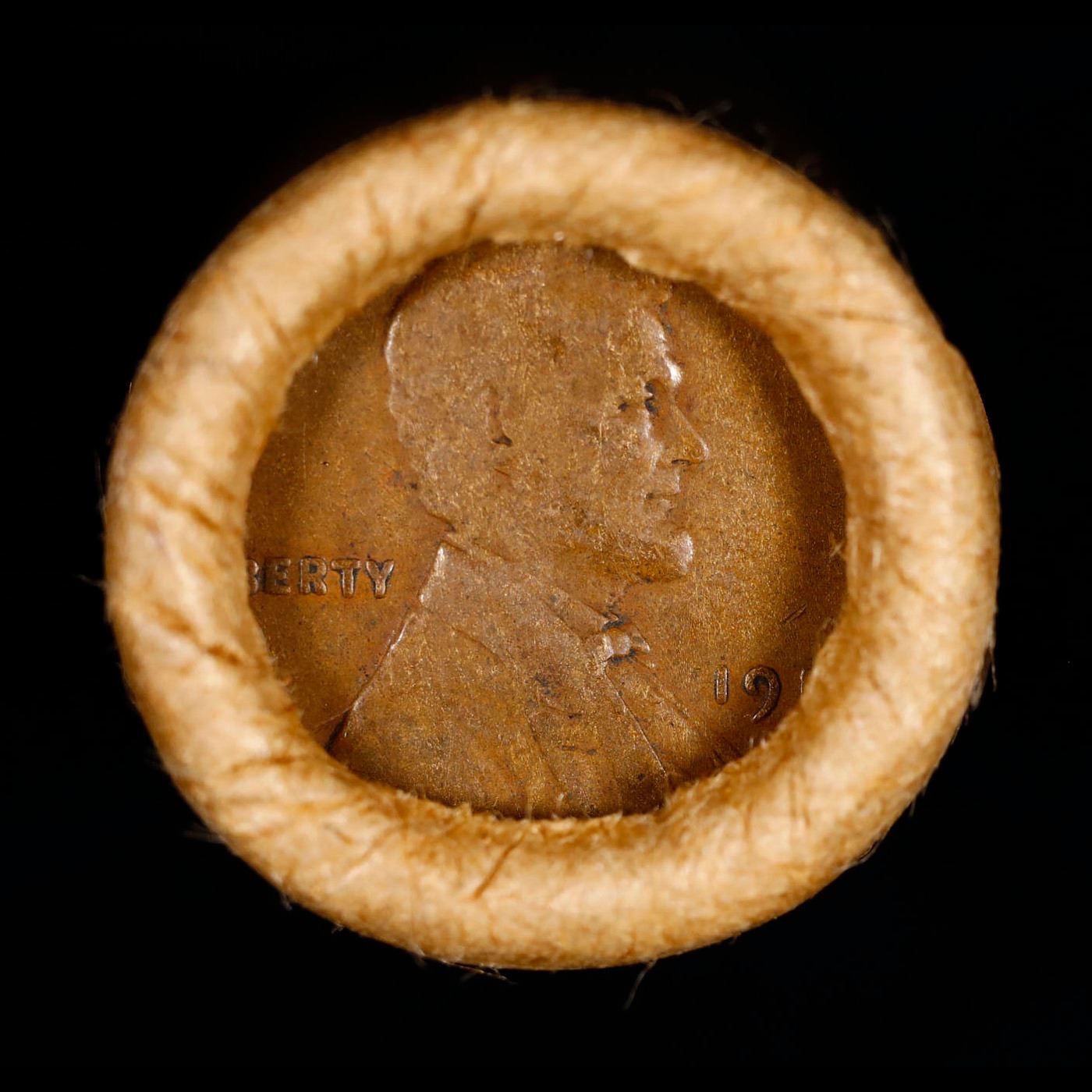 Mixed small cents 1c orig shotgun roll, 1919-s Wheat Cent, 1890 Indian Cent other end, Brinks Wrappe