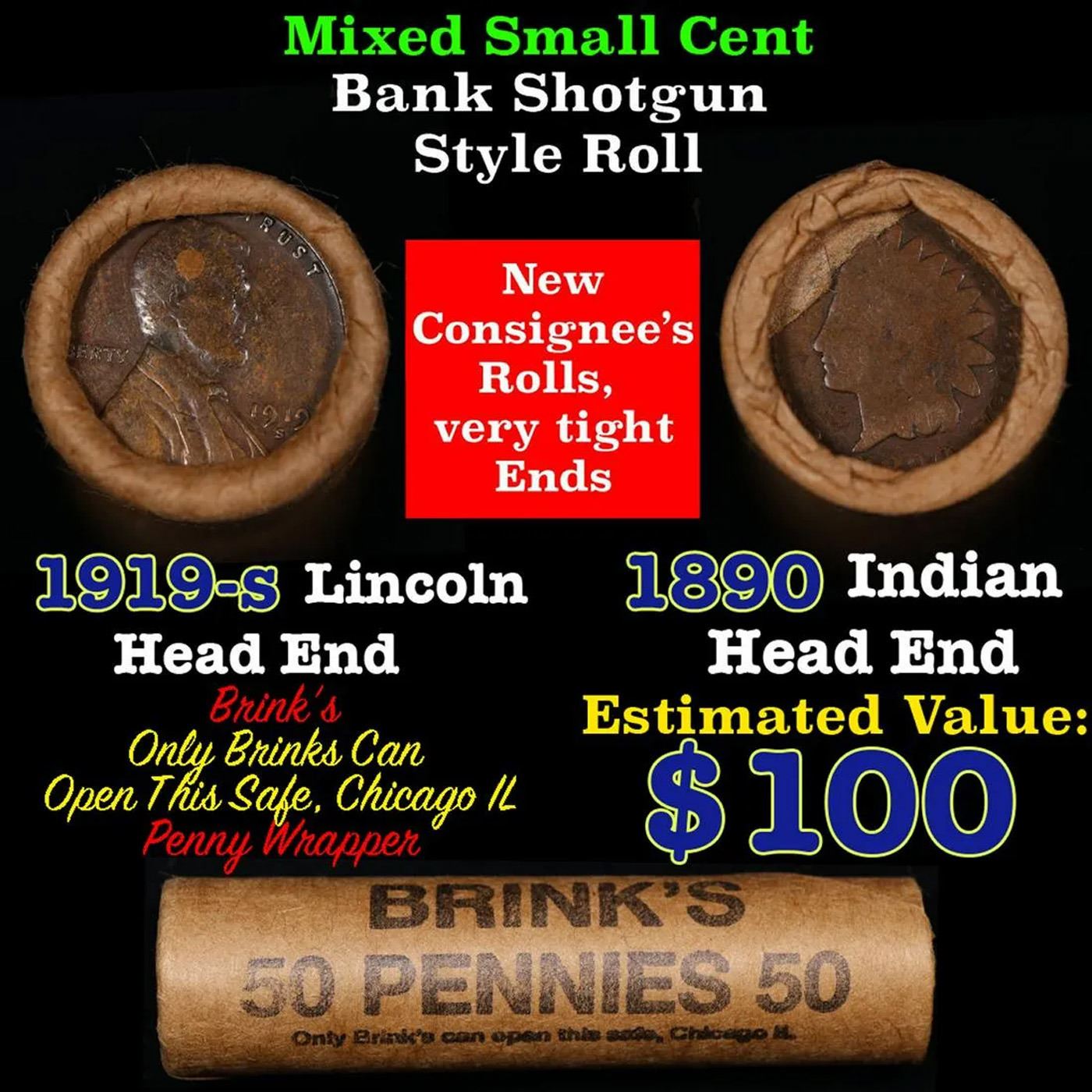 Mixed small cents 1c orig shotgun roll, 1919-s Wheat Cent, 1890 Indian Cent other end, Brinks Wrapper.. The roll is held in an old Rare & Collectable Brinks 'Only Brinks Can Open This Safe, Chicago IL' Penny wrapper. Actual roll pictured is the roll you will get. A great original bank shotgun roll with very tight ends. We have opened a few of these rolls. They seem to be mixed small cents including Indians, Wheats, Steel cents & some Flying Eagles mixed in. These shotgun rolls are all from a new consignee. They are all frrom one Estate.