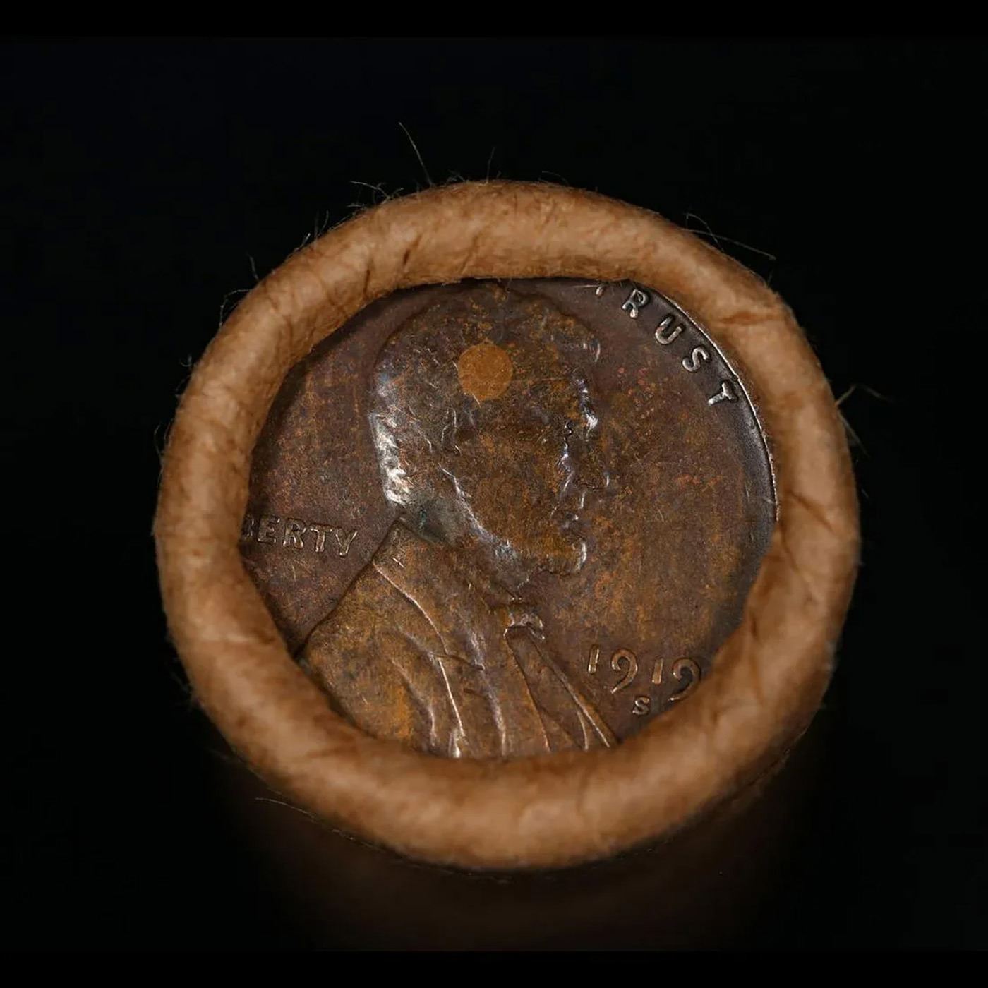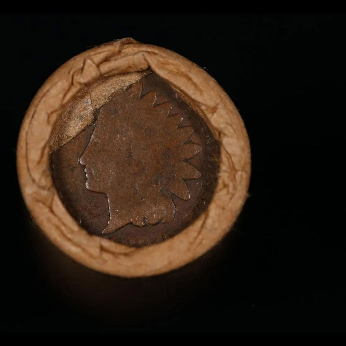 Mixed small cents 1c orig shotgun roll, 1919-s Wheat Cent, 1890 Indian Cent other end, Brinks Wrappe