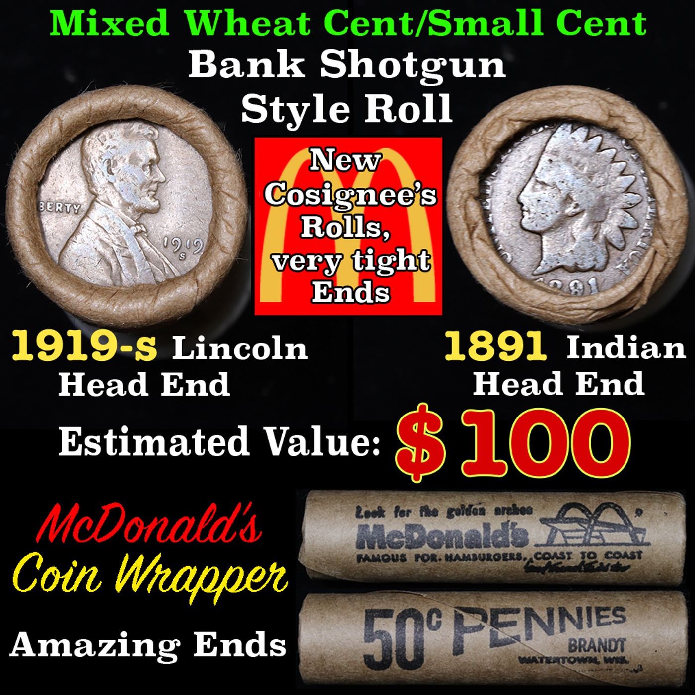 Mixed small cents 1c orig shotgun roll, 1919-s Wheat Cent, 1891 Indian Cent other end, McDonalds Wrapper. The roll is held in an old Rare & Collectable McDonalds Brandt wrapper. Look For The Golden Arches. Actual roll pictured is the roll you will get. A great original bank shotgun roll with very tight ends. We have opened a few of these rolls. They seem to be mixed small cents including Indians, Wheats, Steel cents & some Flying Eagles mixed in. These shotgun rolls are all from a new consignee. They are all frrom one Estate.