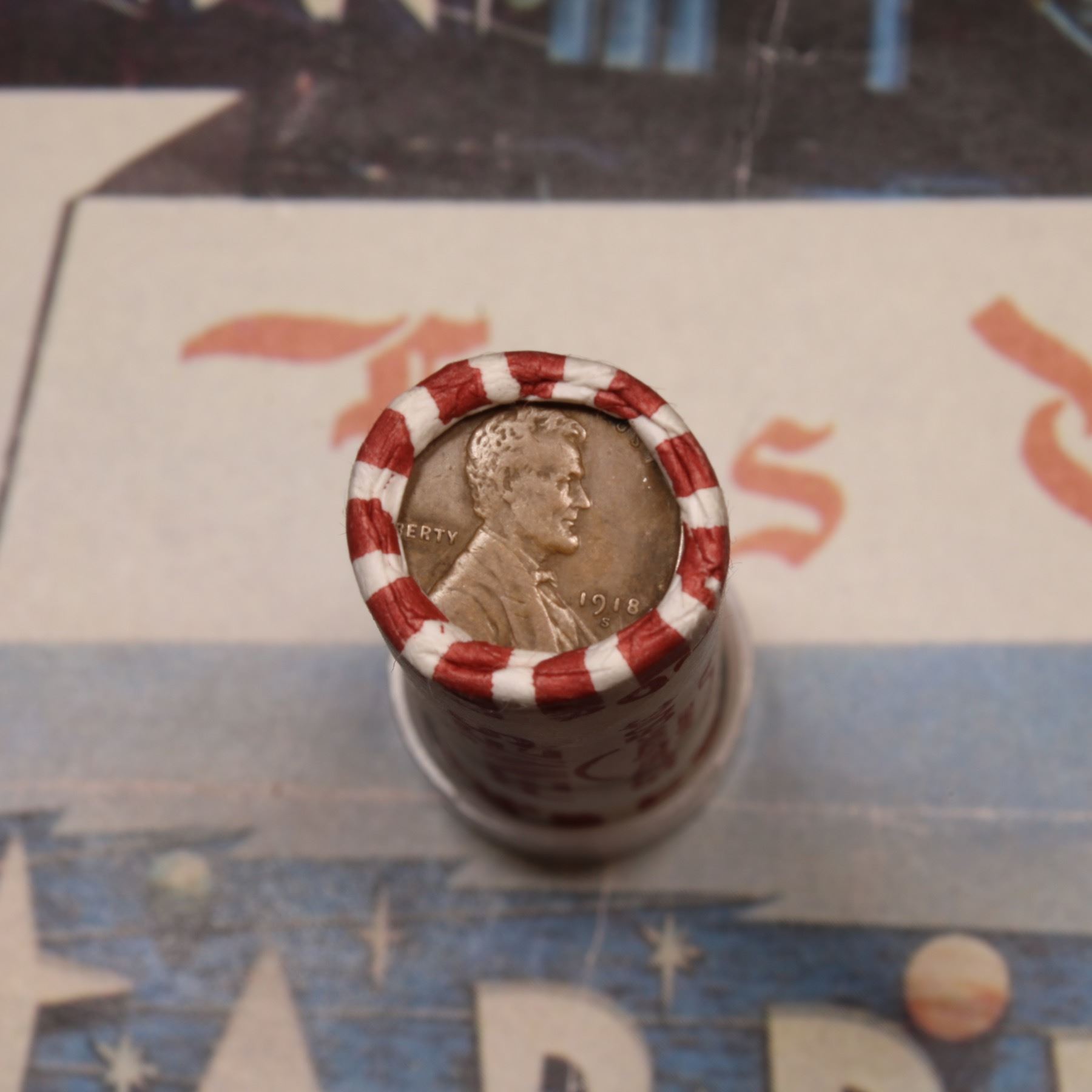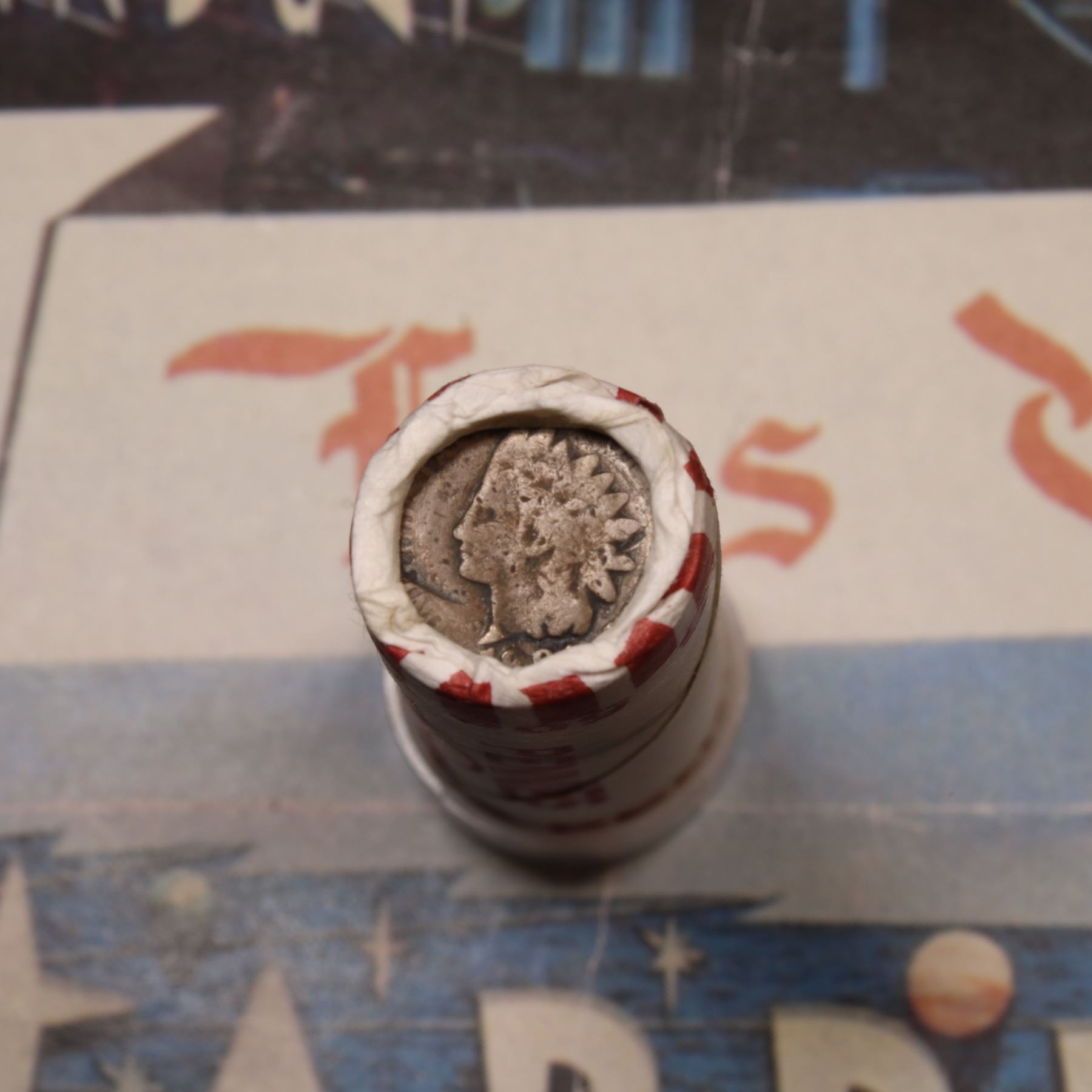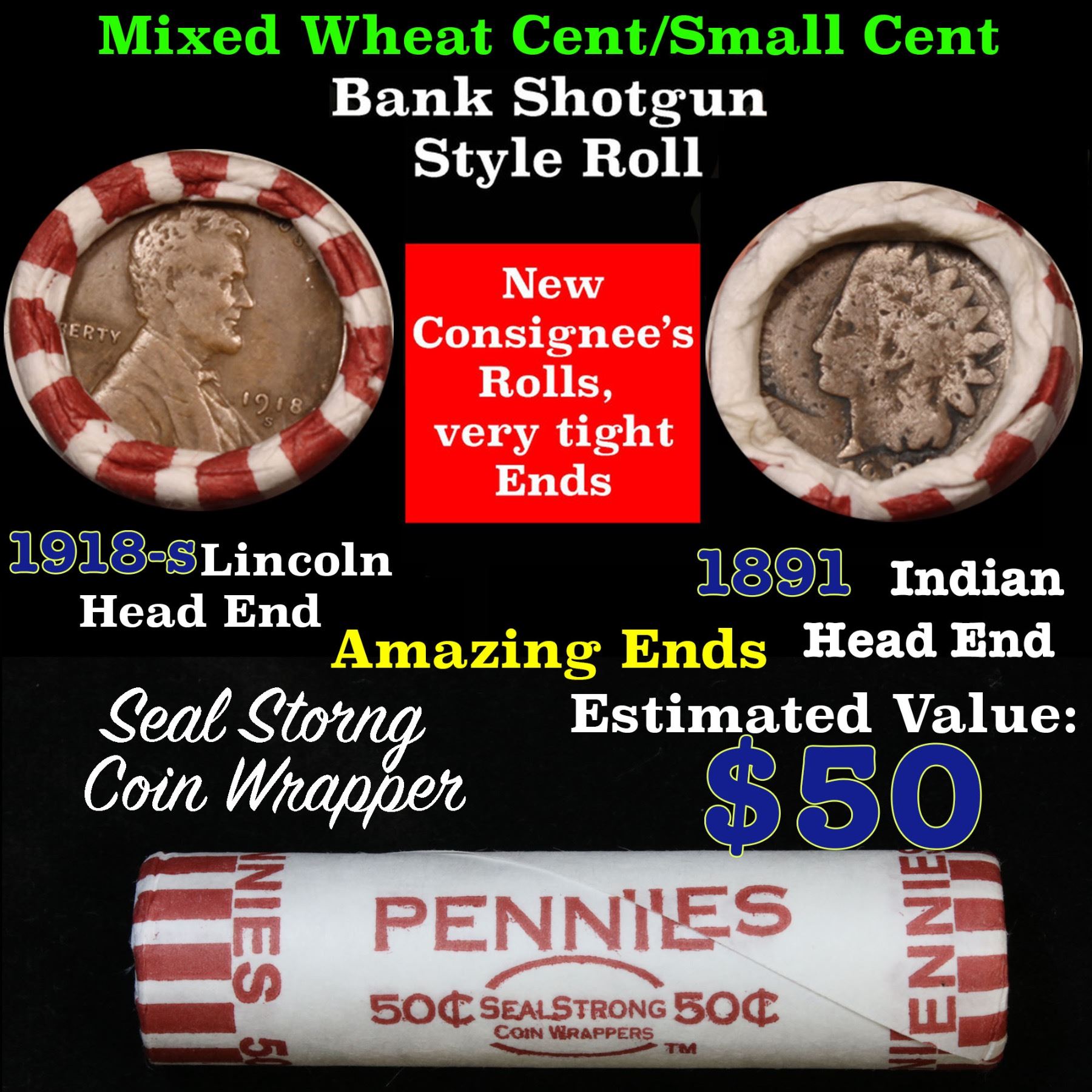 Mixed small cents 1c orig shotgun roll, 1919-s Wheat Cent, 1891 Indian Cent other end. The roll is held in an old Seal Strong wrapper. Actual roll pictured is the roll you will get. A great original bank shotgun roll with very tight ends. We have been getting excellent feedback on these rolls. Were being told that close to half the roll are teens, some with mintmarks, there are a few Indians in all the rolls, most of the rolls have steel cents. They seem to be PQ Wheaties rolls. These shotgun rolls are all from a new consignee. They are all frrom one Estate.
