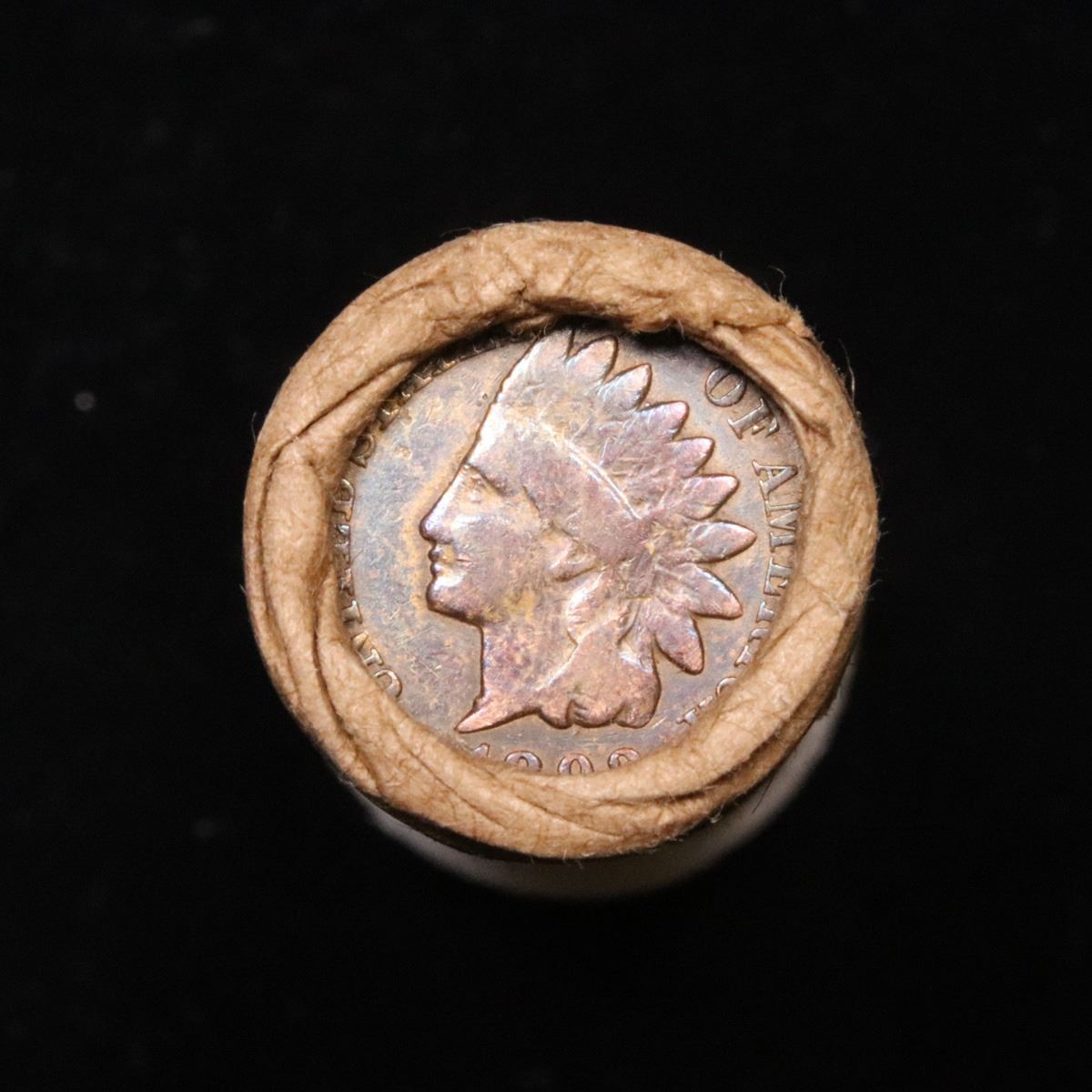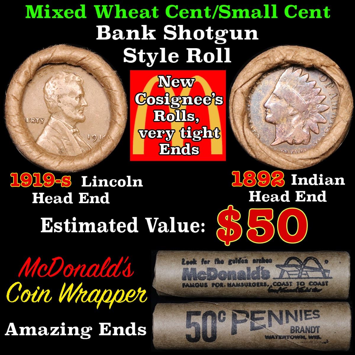 Mixed small cents 1c orig shotgun roll, 1919-s Wheat Cent, 1892 Indian Cent other end. The roll is held in an old Rare & Collectable McDonalds Brandt wrapper. Actual roll pictured is the roll you will get. A great original bank shotgun roll with very tight ends. We have opened a few of these rolls. They seem to be mixed small cents including Indians, Wheats, Steel cents & some Flying Eagles mixed in. These shotgun rolls are all from a new consignee. They are all frrom one Estate.