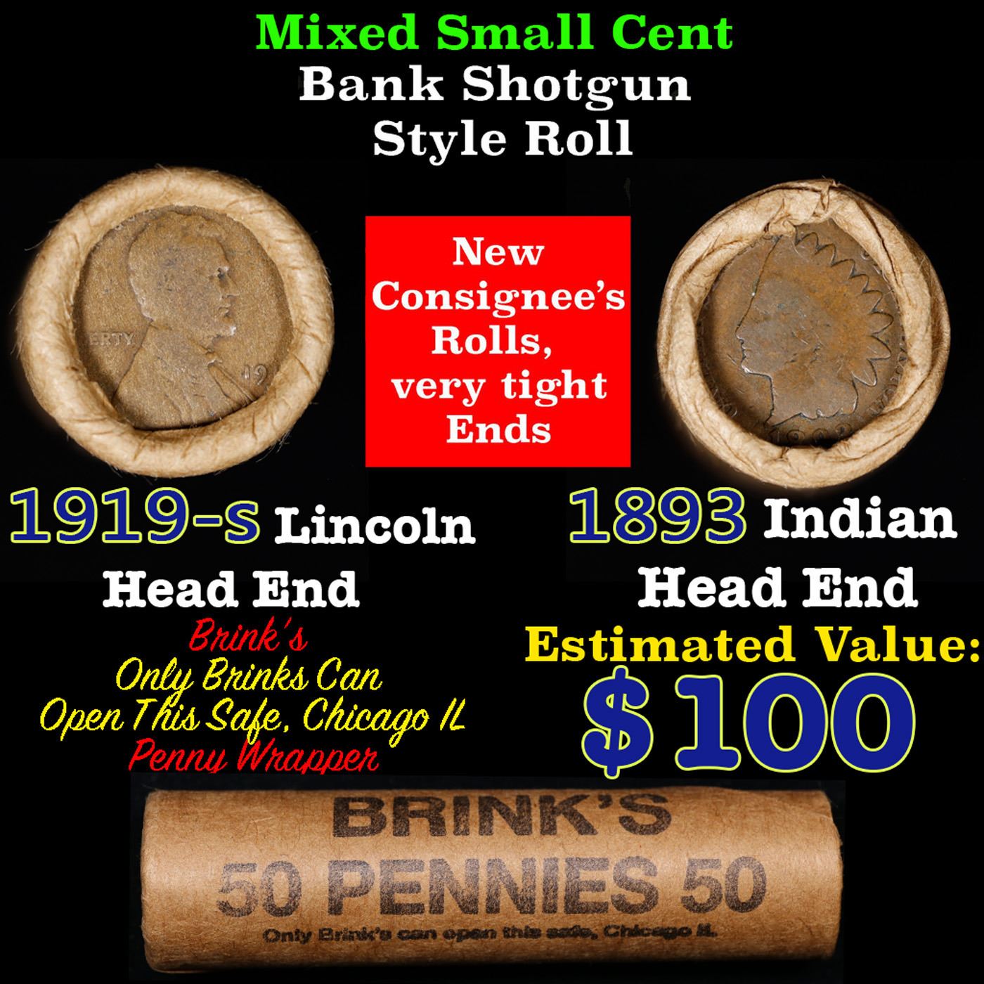 Mixed small cents 1c orig shotgun roll, 1919-s Wheat Cent, 1893 Indian Cent other end, Brinks Wrapper.. The roll is held in an old Rare & Collectable Brinks 'Only Brinks Can Open This Safe, Chicago IL' Penny wrapper. Actual roll pictured is the roll you will get. A great original bank shotgun roll with very tight ends. We have opened a few of these rolls. They seem to be mixed small cents including Indians, Wheats, Steel cents & some Flying Eagles mixed in. These shotgun rolls are all from a new consignee. They are all frrom one Estate.