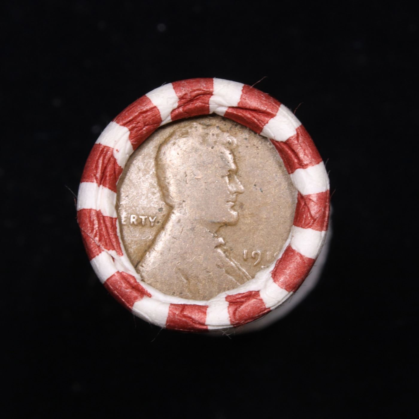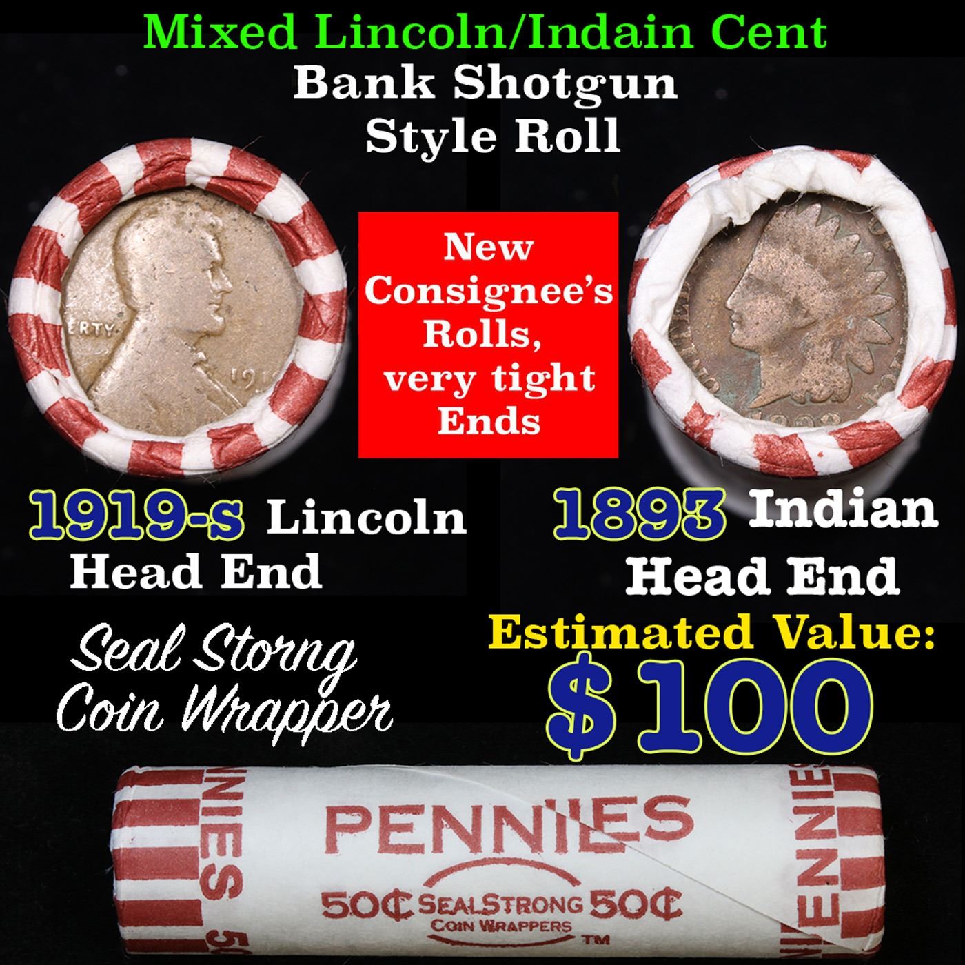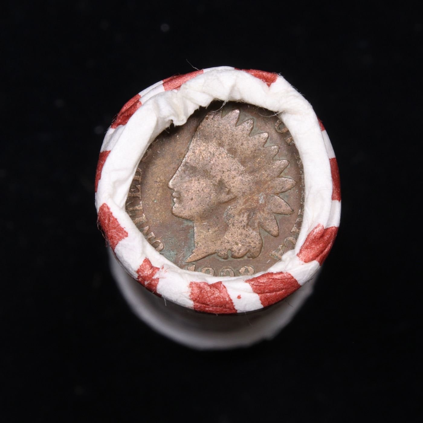 Mixed small cents 1c orig shotgun roll, 1919-s Wheat Cent, 1893 Indian Cent other end, N.F. String &