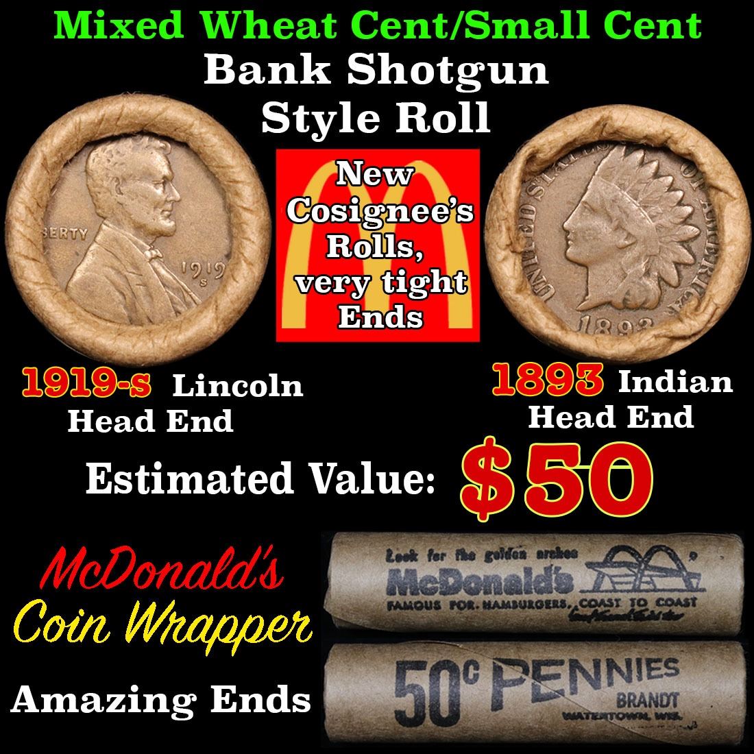 Mixed small cents 1c orig shotgun roll, 1919-s Wheat Cent, 1893 Indian Cent other end. The roll is held in an old Collectable Mcdonalds Brant wrapper. Actual roll pictured is the roll you will get. A great original bank shotgun roll with very tight ends. We have been getting excellent feedback on these rolls. Were being told that close to half the roll are teens, some with mintmarks, there are a few Indians in all the rolls, most of the rolls have steel cents. They seem to be PQ Wheaties rolls. These shotgun rolls are all from a new consignee. They are all frrom one Estate.