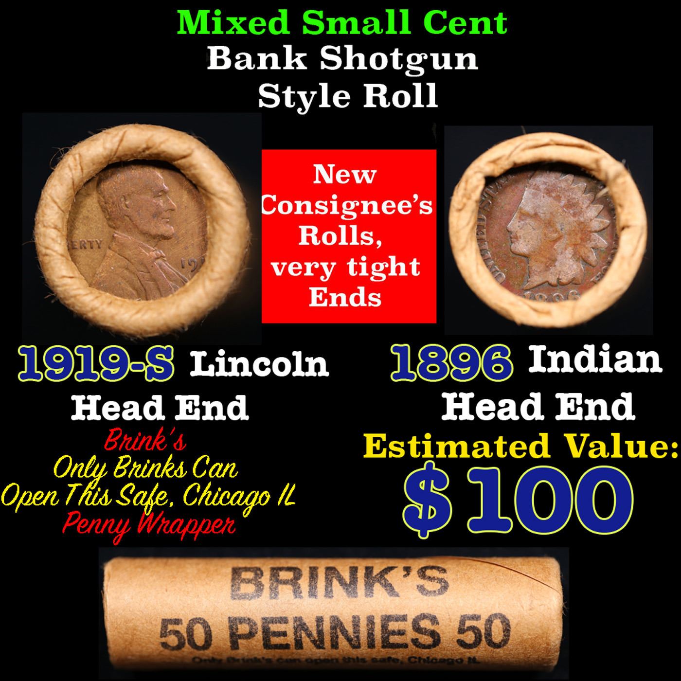 Mixed small cents 1c orig shotgun roll, 1919-s Wheat Cent, 1896 Indian Cent other end, brinks Wrapper. The roll is held in an old Rare & Collectable Brinks 'Only Brinks Can Open This Safe, Chicago IL' Penny wrapper. Actual roll pictured is the roll you will get. A great original bank shotgun roll with very tight ends. We have opened a few of these rolls. They seem to be mixed small cents including Indians, Wheats, Steel cents & some Flying Eagles mixed in. These shotgun rolls are all from a new consignee. They are all frrom one Estate.