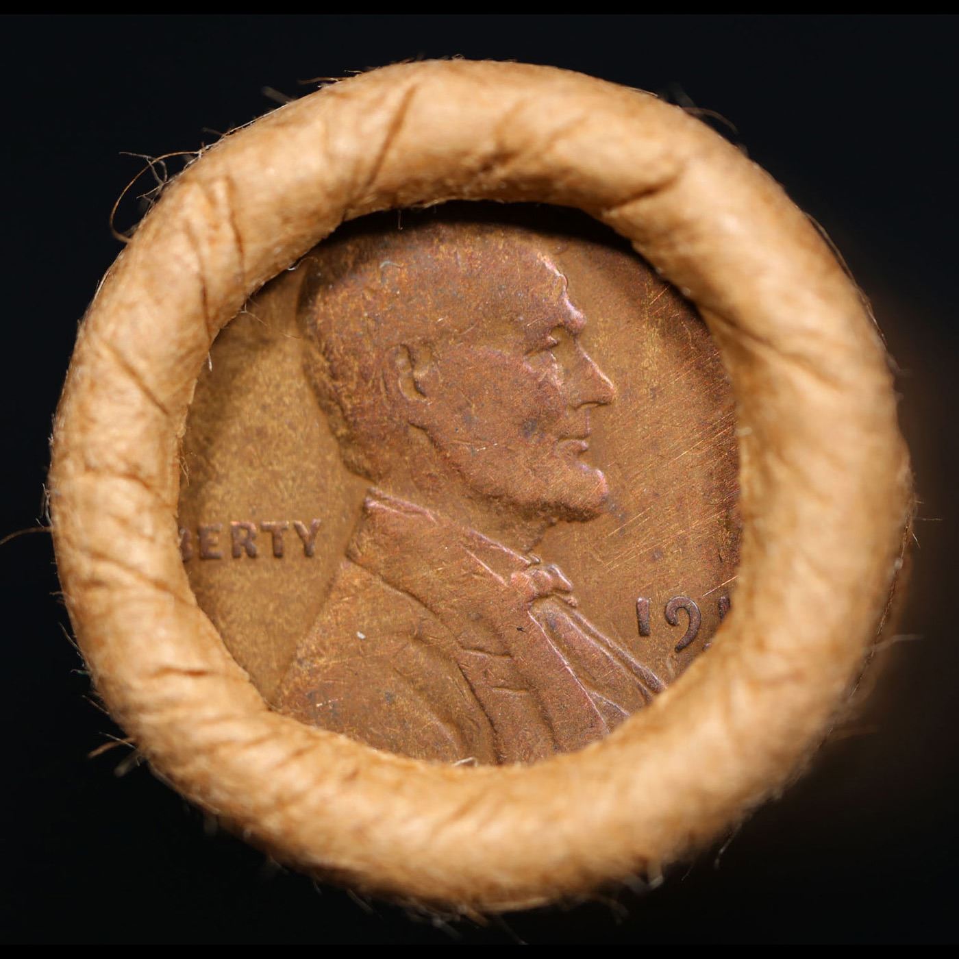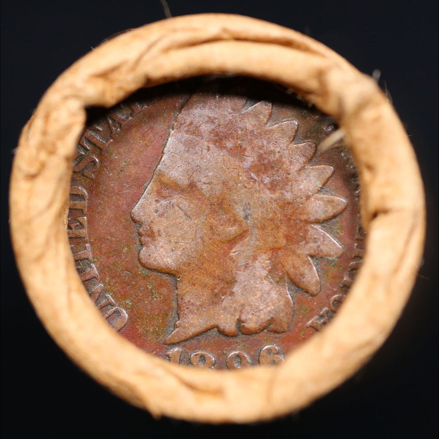 Mixed small cents 1c orig shotgun roll, 1919-s Wheat Cent, 1896 Indian Cent other end, brinks Wrapp