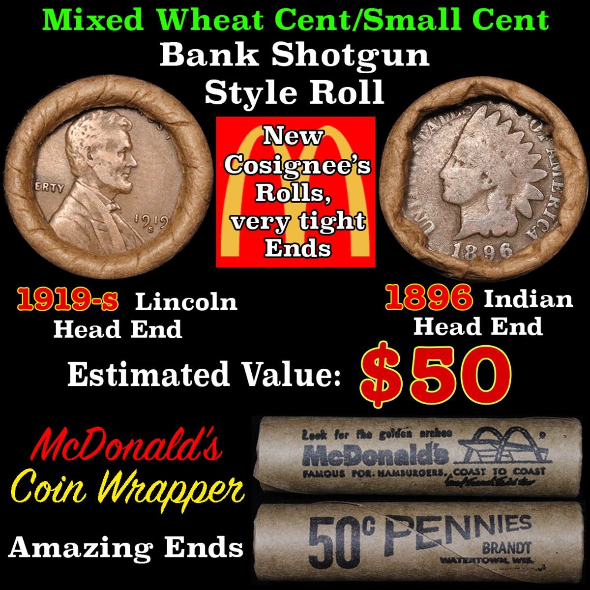 Mixed small cents 1c orig shotgun roll, 1919-s Wheat Cent, 1896 Indian Cent other end . .. The roll is held in an old Rare & Collectable McDonalds Brandt wrapper. Actual roll pictured is the roll you will get. A great original bank shotgun roll with very tight ends. We have opened a few of these rolls. They seem to be mixed small cents including Indians, Wheats, Steel cents & some Flying Eagles mixed in. These shotgun rolls are all from a new consignee. They are all frrom one Estate.
