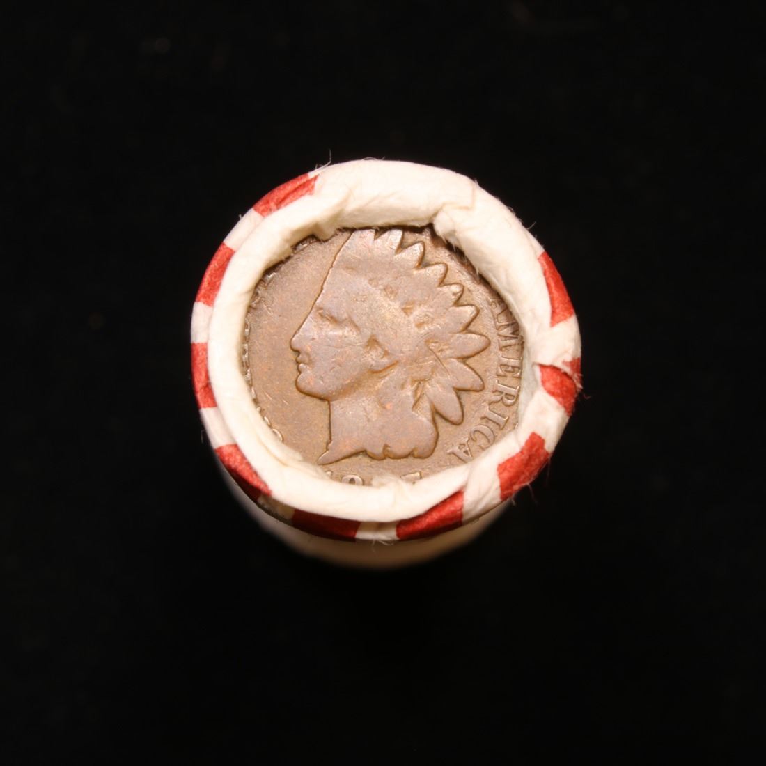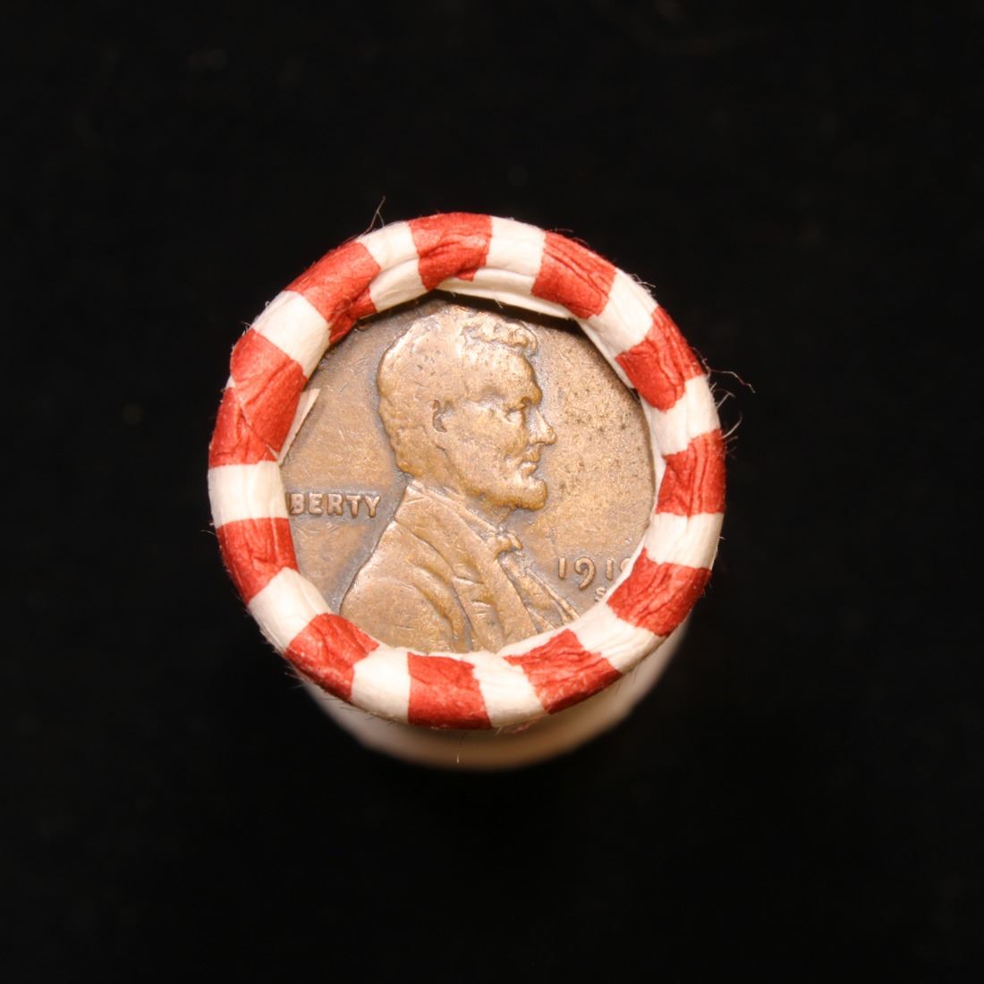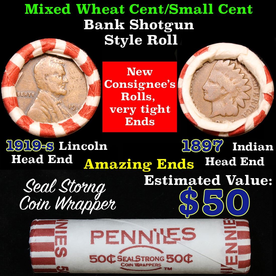 Mixed small cents 1c orig shotgun roll, 1919-s Wheat Cent, 1897 Indian Cent other end. The roll is held in an old Seal Strong wrapper. Actual roll pictured is the roll you will get. A great original bank shotgun roll with very tight ends. We have been getting excellent feedback on these rolls. Were being told that close to half the roll are teens, some with mintmarks, there are a few Indians in all the rolls, most of the rolls have steel cents. They seem to be PQ Wheaties rolls. These shotgun rolls are all from a new consignee. They are all frrom one Estate.