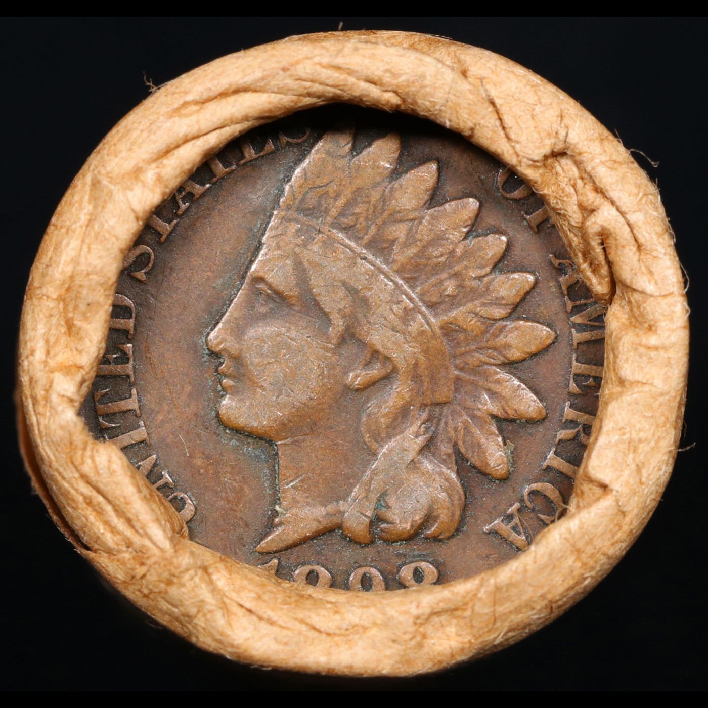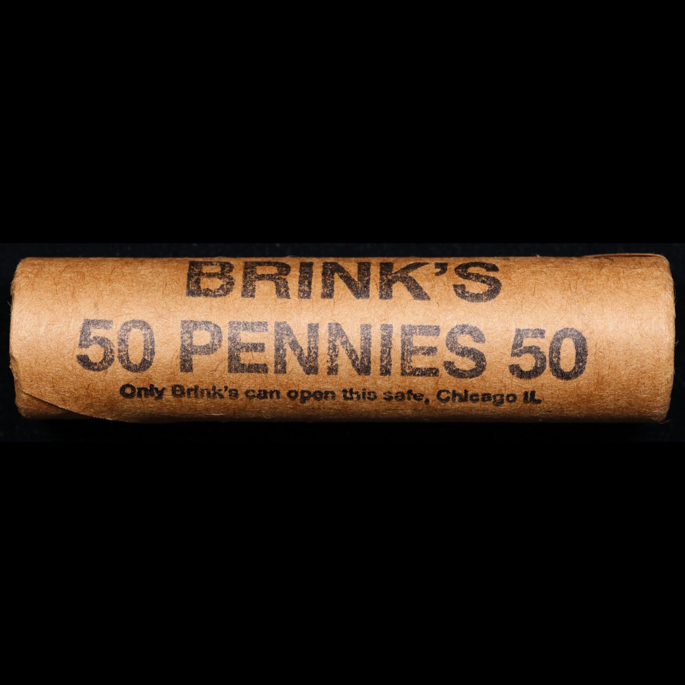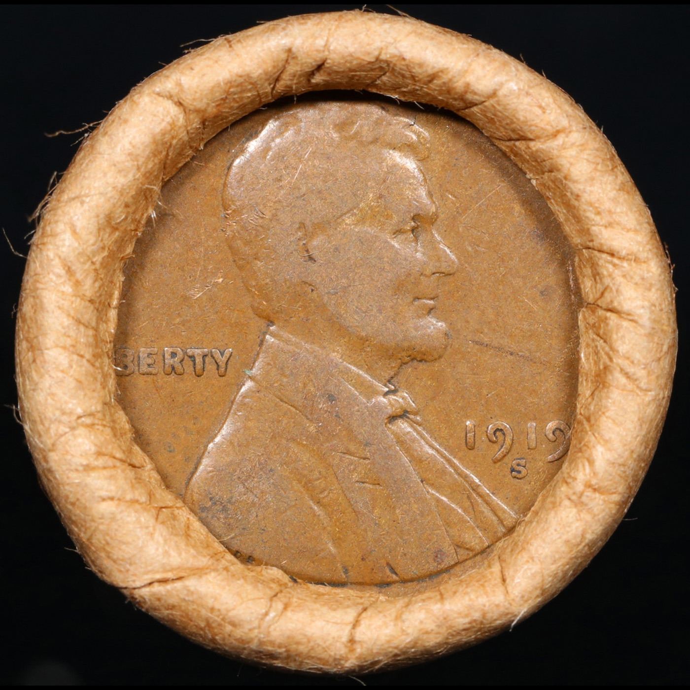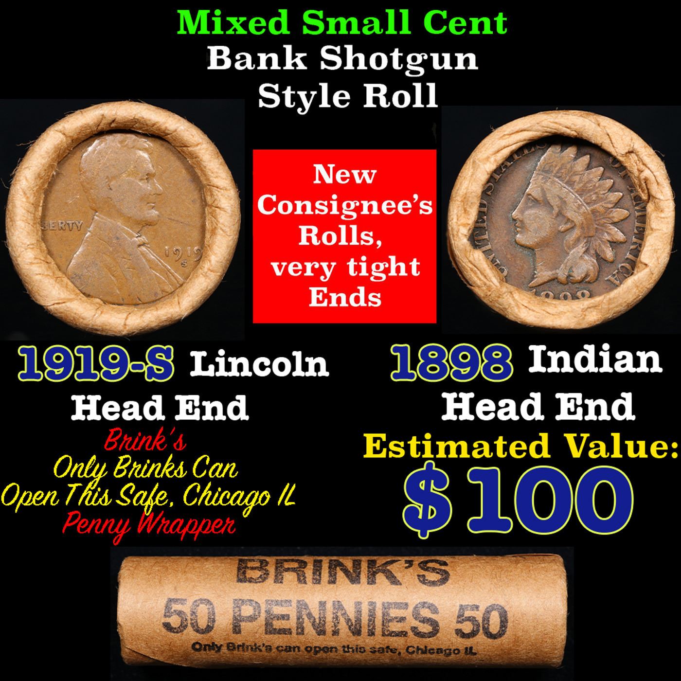 Mixed small cents 1c orig shotgun roll, 1919-s Wheat Cent, 1898 Indian Cent other end, Brinks Wra
