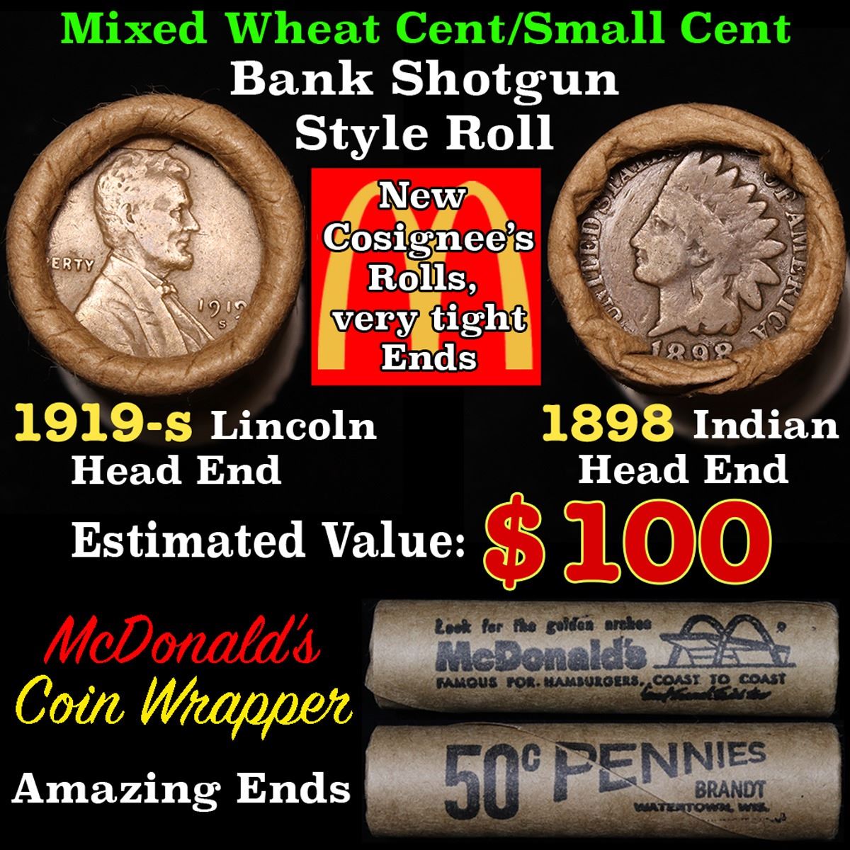 Mixed small cents 1c orig shotgun roll, 1919-s Wheat Cent, 1898 Indian Cent other end, McDonalds Wrapper. The roll is held in an old Rare & Collectable McDonalds Brandt wrapper. Look For The Golden Arches. Actual roll pictured is the roll you will get. A great original bank shotgun roll with very tight ends. We have opened a few of these rolls. They seem to be mixed small cents including Indians, Wheats, Steel cents & some Flying Eagles mixed in. These shotgun rolls are all from a new consignee. They are all frrom one Estate.