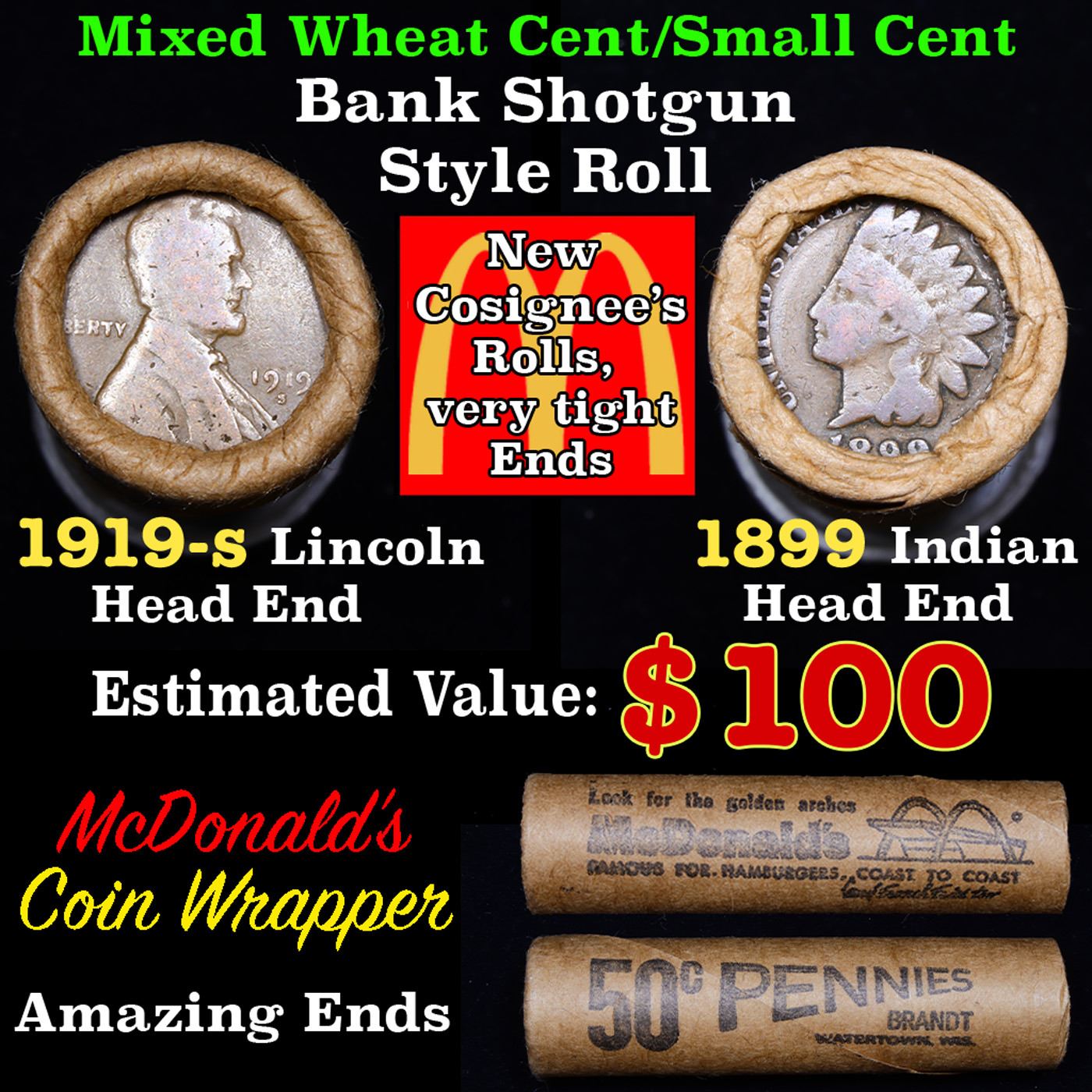 Mixed small cents 1c orig shotgun roll, 1919-s Wheat Cent, 1899 Indian Cent other end, McDonalds Wrapper. The roll is held in an old Rare & Collectable McDonalds Brandt wrapper. Look For The Golden Arches. Actual roll pictured is the roll you will get. A great original bank shotgun roll with very tight ends. We have opened a few of these rolls. They seem to be mixed small cents including Indians, Wheats, Steel cents & some Flying Eagles mixed in. These shotgun rolls are all from a new consignee. They are all frrom one Estate.