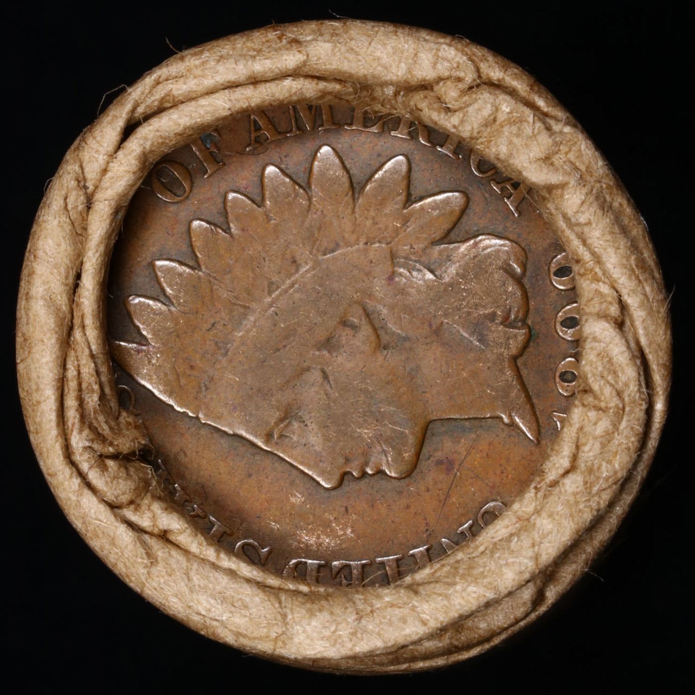Mixed small cents 1c orig shotgun roll, 1919-s Wheat Cent, 1899 Indian Cent other end, brinks Wrappe
