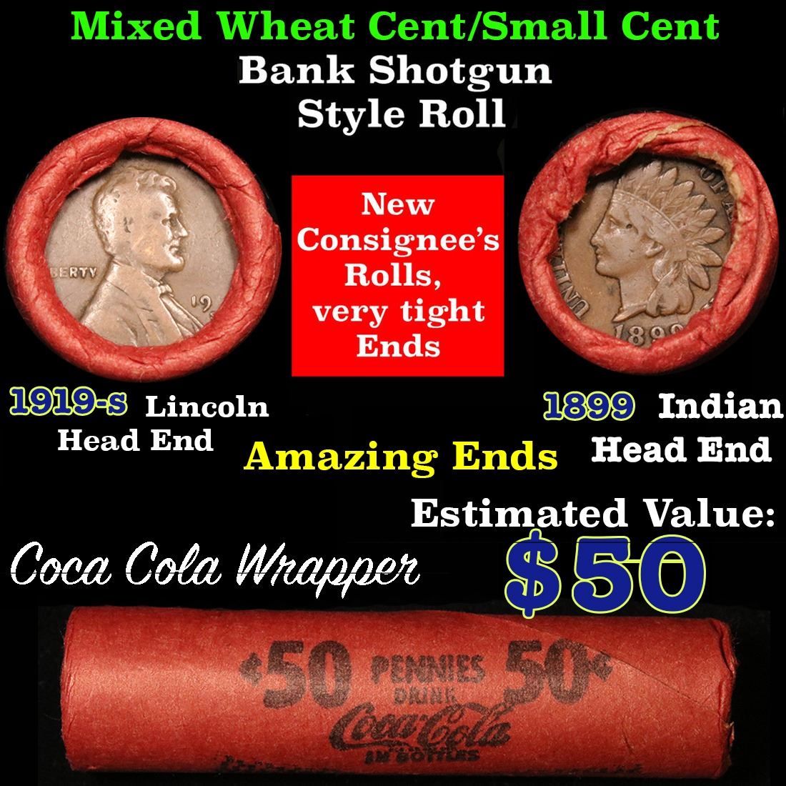Mixed small cents 1c orig shotgun roll, 1919-s Wheat Cent, 1899 Indian Cent other end. The roll is held in an old Seal Strong wrapper. Actual roll pictured is the roll you will get. A great original bank shotgun roll with very tight ends. We have been getting excellent feedback on these rolls. Were being told that close to half the roll are teens, some with mintmarks, there are a few Indians in all the rolls, most of the rolls have steel cents. They seem to be PQ Wheaties rolls. These shotgun rolls are all from a new consignee. They are all frrom one Estate.