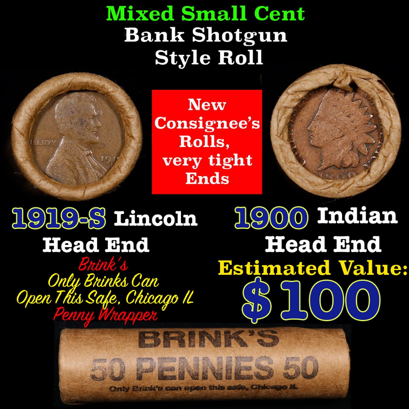 Mixed small cents 1c orig shotgun roll, 1919-s Wheat Cent, 1900 Indian Cent other end, Brinks Wrappe