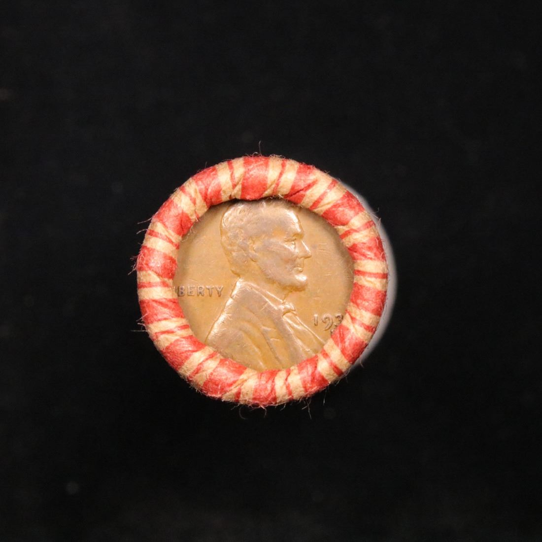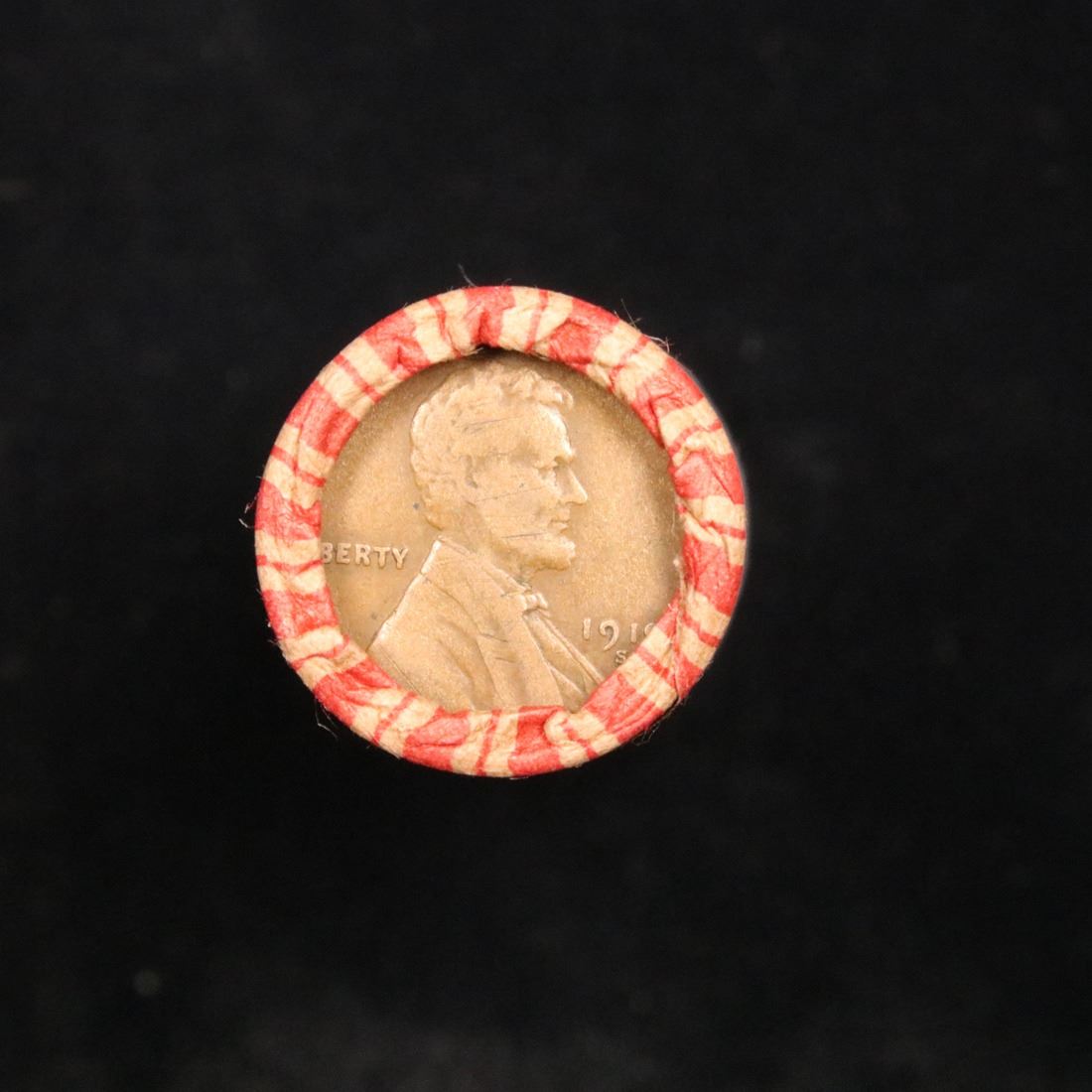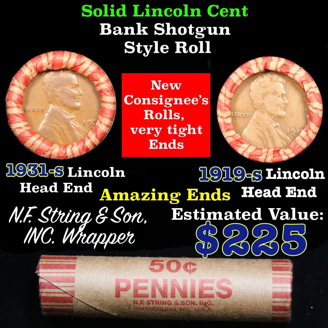 Mixed small cents 1c orig shotgun roll, 1919-s Wheat Cent, 1931-s Wheat Cent other end. The roll is held in an old Seal Strong wrapper. Actual roll pictured is the roll you will get. A great original bank shotgun roll with very tight ends. We have been getting excellent feedback on these rolls. Were being told that close to half the roll are teens, some with mintmarks, there are a few Indians in all the rolls, most of the rolls have steel cents. They seem to be PQ Wheaties rolls. These shotgun rolls are all from a new consignee. They are all frrom one Estate.