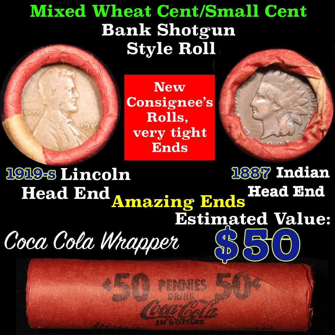 Mixed small cents 1c orig shotgun roll, 1919-s one end, 1887 Indian cent other end. The roll is held in an old, rare and collectible Coca-Cola wrapper. Actual roll pictured is the roll you will get. A great original bank shotgun roll with very tight ends. We have been getting excellent feedback on these rolls. Were being told that close to half the roll are teens, some with mintmarks, there are a few Indians in all the rolls, most of the rolls have steel cents. They seem to be PQ Wheaties rolls. These shotgun rolls are all from a new consignee. They are all frrom one Estate. This particular Roll shows a 1919-s on one end and an 1887 Indian on the other end.