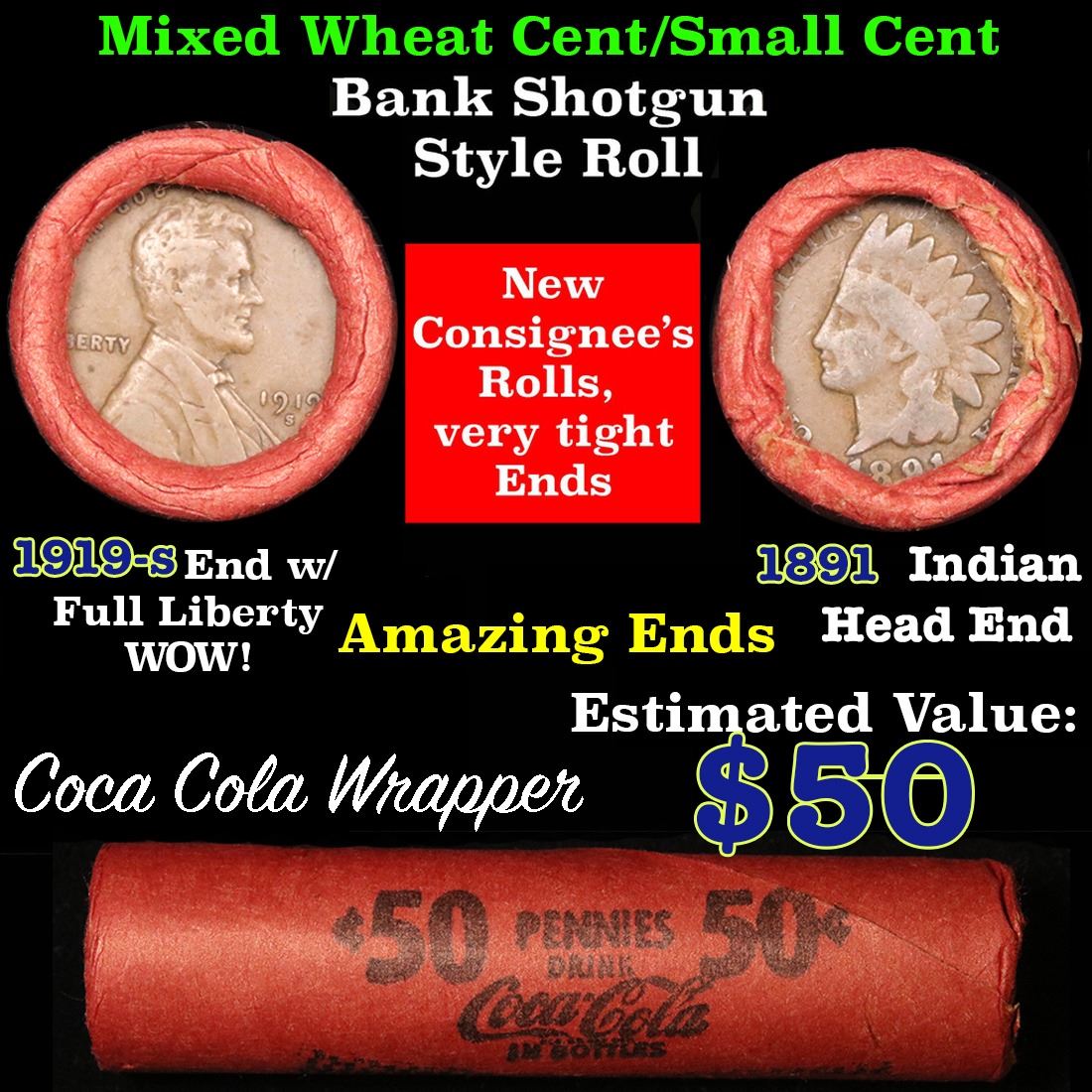 Mixed small cents 1c orig shotgun roll, 1919-s one end, 1891 Indian cent other end. The roll is held in an old, rare and collectible Coca-Cola wrapper. Actual roll pictured is the roll you will get. A great original bank shotgun roll with very tight ends. We have been getting excellent feedback on these rolls. Were being told that close to half the roll are teens, some with mintmarks, there are a few Indians in all the rolls, most of the rolls have steel cents. They seem to be PQ Wheaties rolls. These shotgun rolls are all from a new consignee. They are all frrom one Estate. This particular Roll shows a 1919-s on one end and an 1891 Indian on the other end.
