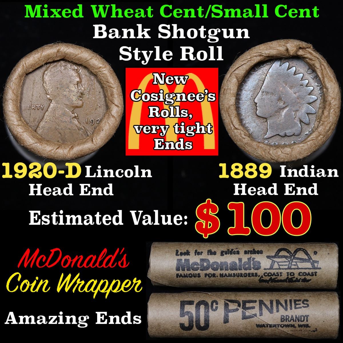 Mixed small cents 1c orig shotgun roll, 1920-d Wheat Cent, 1889 Indian Cent other end, McDonalds Wrapper. The roll is held in an old Rare & Collectable McDonalds Brandt wrapper. Look For The Golden Arches. Actual roll pictured is the roll you will get. A great original bank shotgun roll with very tight ends. We have opened a few of these rolls. They seem to be mixed small cents including Indians, Wheats, Steel cents & some Flying Eagles mixed in. These shotgun rolls are all from a new consignee. They are all frrom one Estate.