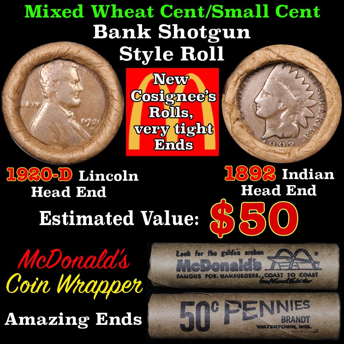 Mixed small cents 1c orig shotgun roll, 1920-d Wheat Cent, 1892 Indian Cent other end . .. The roll is held in an old Rare & Collectable McDonalds Brandt wrapper. Actual roll pictured is the roll you will get. A great original bank shotgun roll with very tight ends. We have opened a few of these rolls. They seem to be mixed small cents including Indians, Wheats, Steel cents & some Flying Eagles mixed in. These shotgun rolls are all from a new consignee. They are all frrom one Estate.