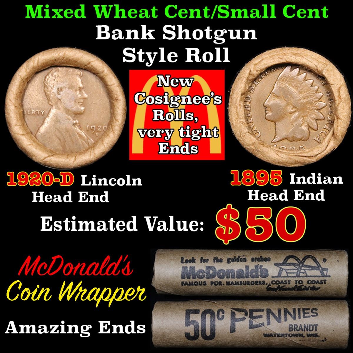 Mixed small cents 1c orig shotgun roll, 1920-d Wheat Cent, 1895 Indian Cent other end . .. The roll is held in an old Rare & Collectable McDonalds Brandt wrapper. Actual roll pictured is the roll you will get. A great original bank shotgun roll with very tight ends. We have opened a few of these rolls. They seem to be mixed small cents including Indians, Wheats, Steel cents & some Flying Eagles mixed in. These shotgun rolls are all from a new consignee. They are all frrom one Estate.