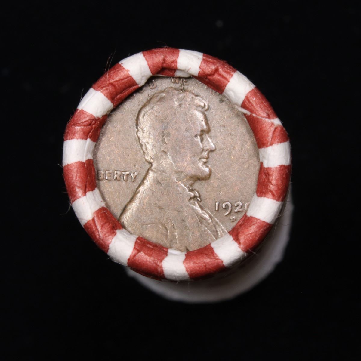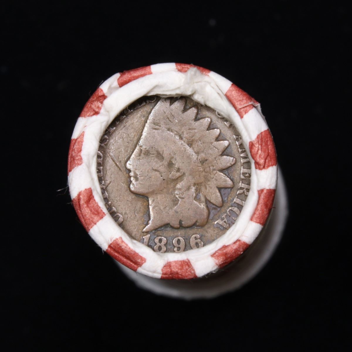 Mixed small cents 1c orig shotgun roll, 1920-d Wheat Cent, 1896 Indian Cent other end, N.F. String &
