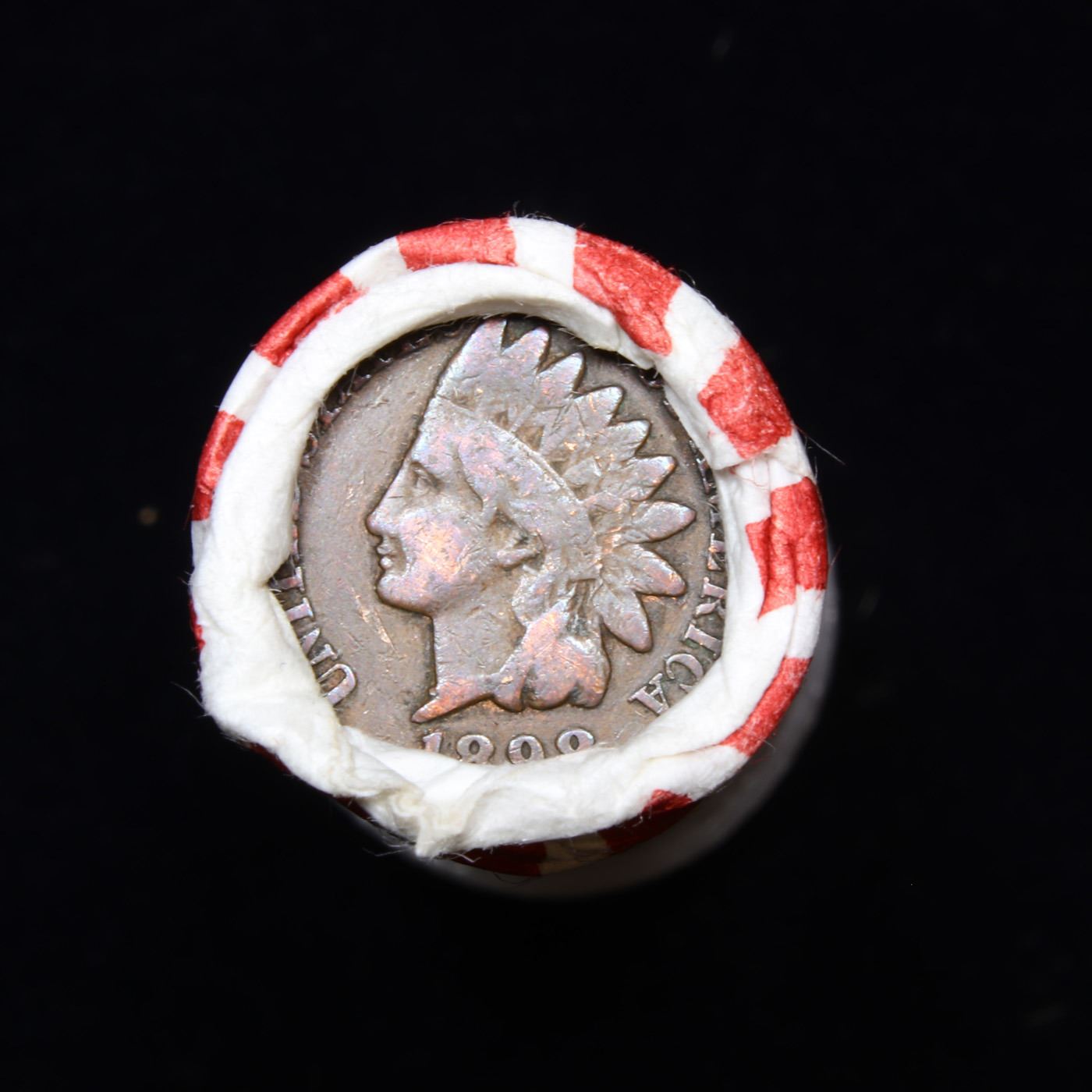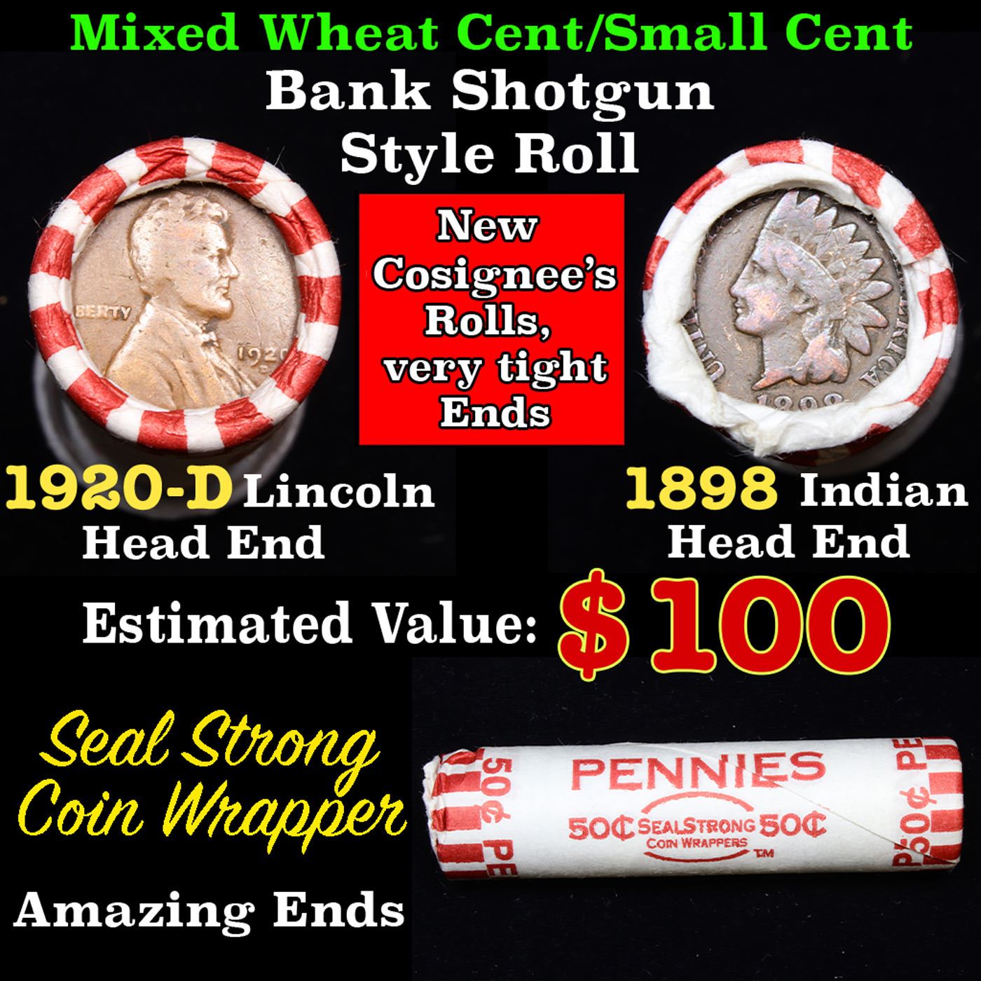 Mixed small cents 1c orig shotgun roll, 1920-d Wheat Cent, 1898 Indian cent other end, Seal Strong W
