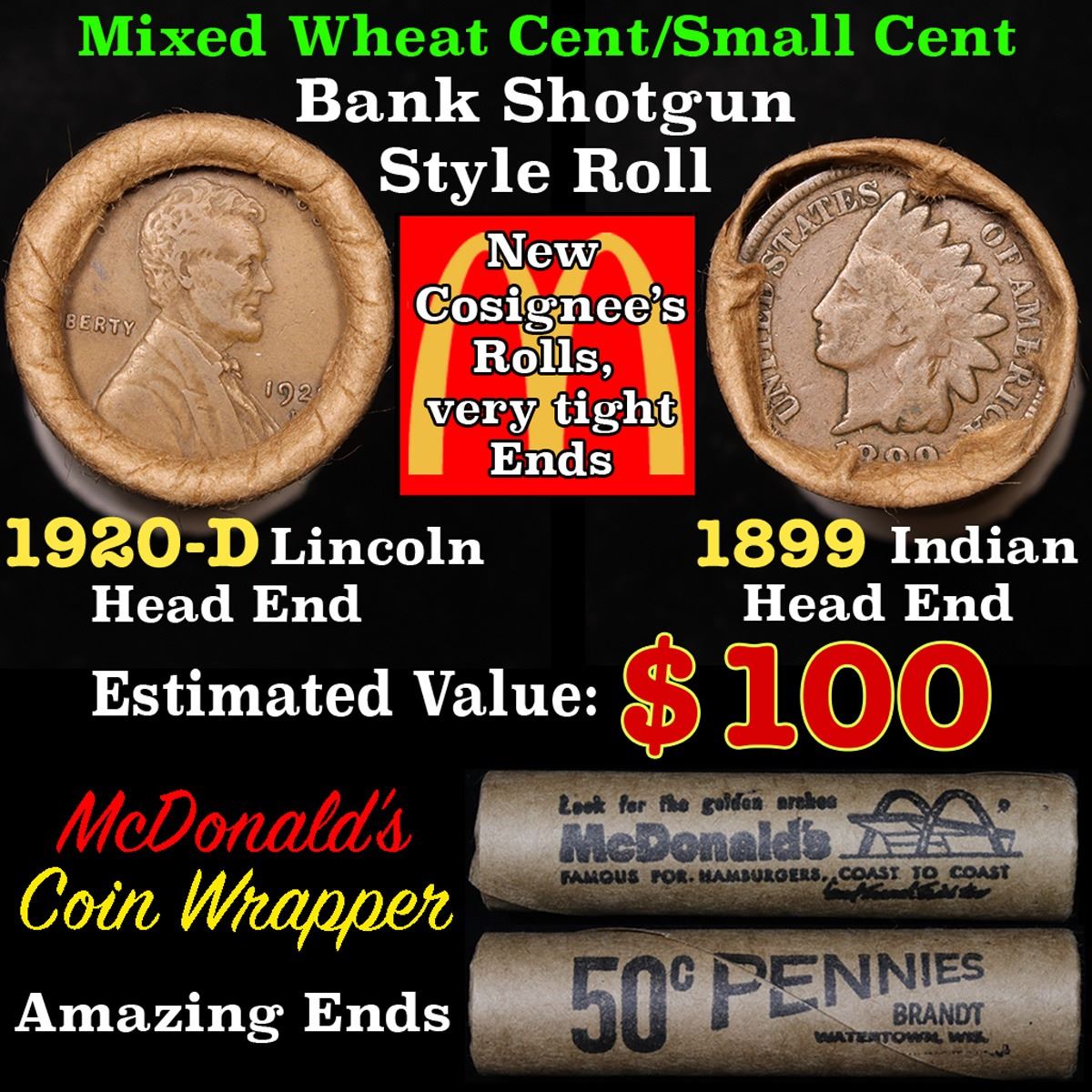 Mixed small cents 1c orig shotgun roll, 1920-d Wheat Cent, 1899 Indian Cent other end,McDnalds Wrapper. The roll is held in an old Rare & Collectable McDonalds Brandt wrapper. Look For The Golden Arches. Actual roll pictured is the roll you will get. A great original bank shotgun roll with very tight ends. We have opened a few of these rolls. They seem to be mixed small cents including Indians, Wheats, Steel cents & some Flying Eagles mixed in. These shotgun rolls are all from a new consignee. They are all frrom one Estate.