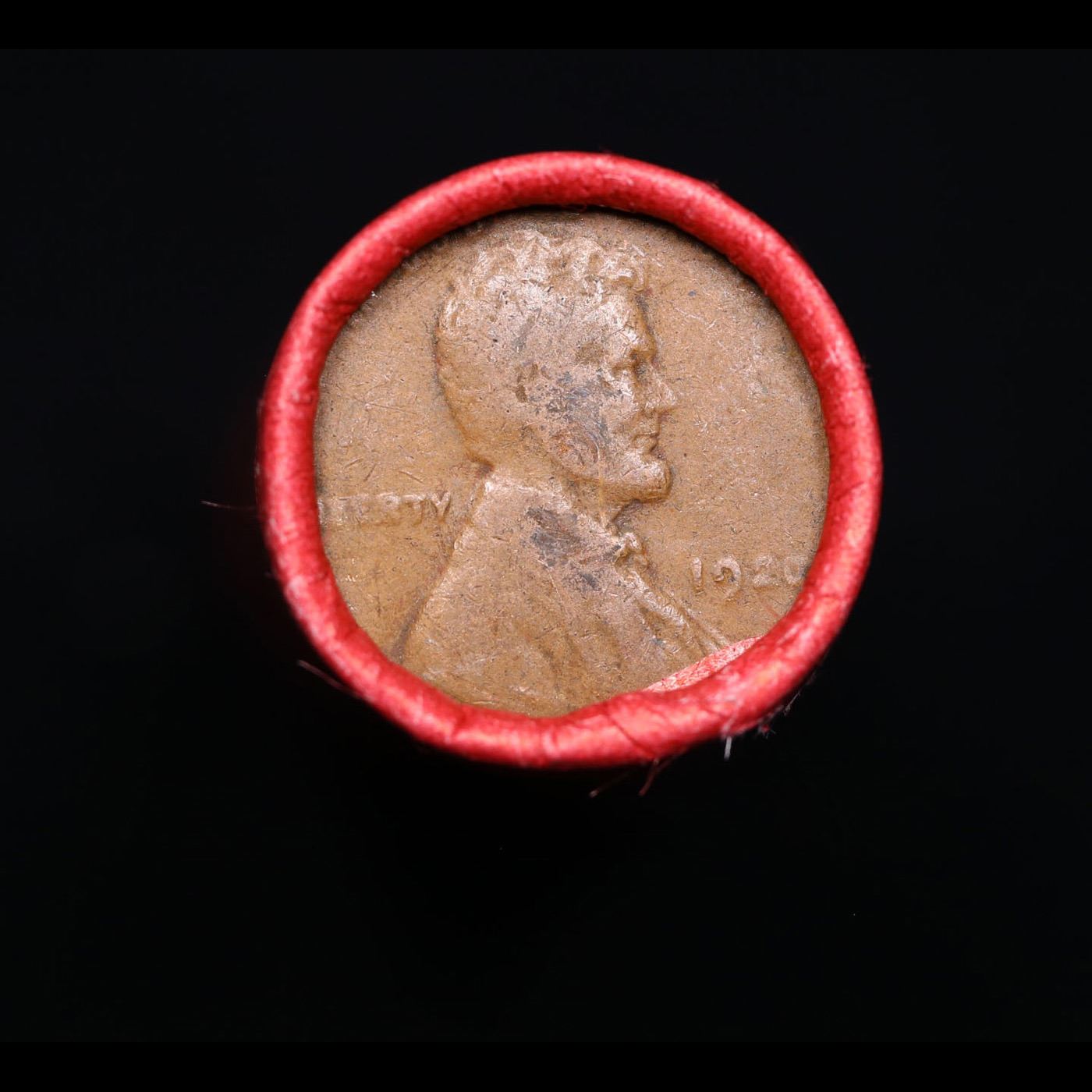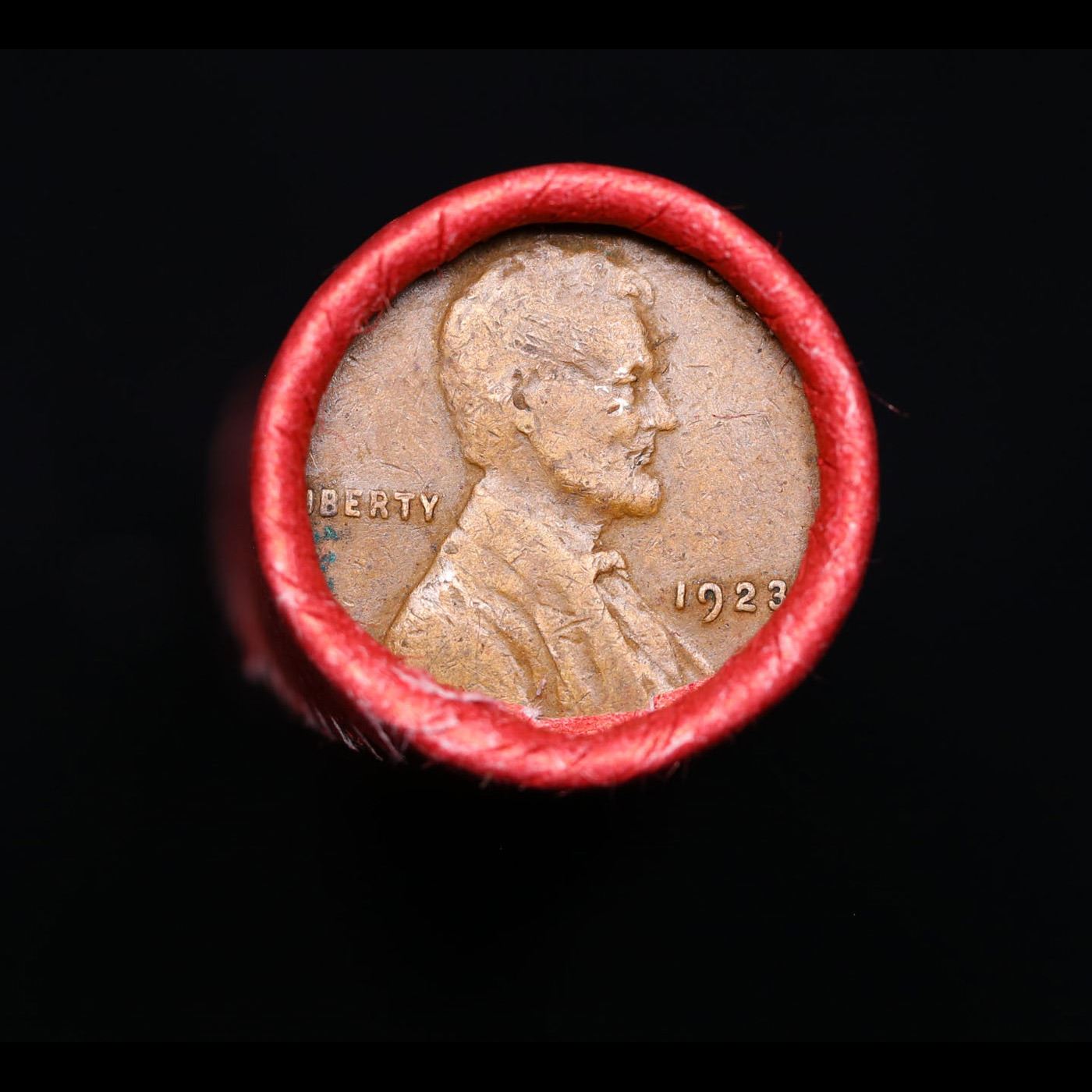 Mixed small cents 1c orig shotgun roll, 1920-p Lincoln Cent, 1923-p Lincoln Cent other end, Nathan's