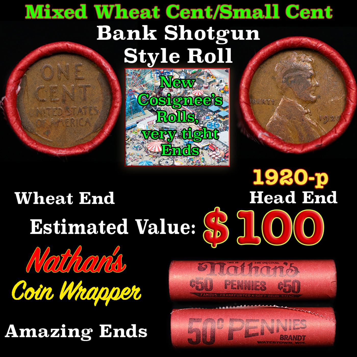 Mixed small cents 1c orig shotgun roll, 1920-p Lincoln Cent, Wheat Cent other end, Nathan's Brandt Wrapper.. The roll is held in an old Rare & Collectable Brinks 'Only Brinks Can Open This Safe, Chicago IL' Penny wrapper. Actual roll pictured is the roll you will get. A great original bank shotgun roll with very tight ends. We have opened a few of these rolls. They seem to be mixed small cents including Indians, Wheats, Steel cents & some Flying Eagles mixed in. These shotgun rolls are all from a new consignee. They are all frrom one Estate.