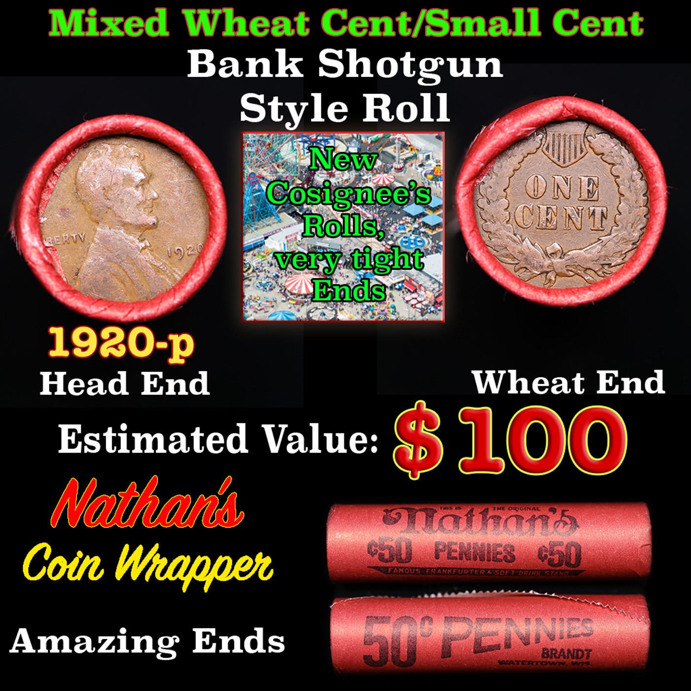 Mixed small cents 1c orig shotgun roll, 1920-p Lincoln Cent, Wheat Cent other end, Nathan's Brandt Wrapper.. The roll is held in an old Rare & Collectable Brinks 'Only Brinks Can Open This Safe, Chicago IL' Penny wrapper. Actual roll pictured is the roll you will get. A great original bank shotgun roll with very tight ends. We have opened a few of these rolls. They seem to be mixed small cents including Indians, Wheats, Steel cents & some Flying Eagles mixed in. These shotgun rolls are all from a new consignee. They are all frrom one Estate.