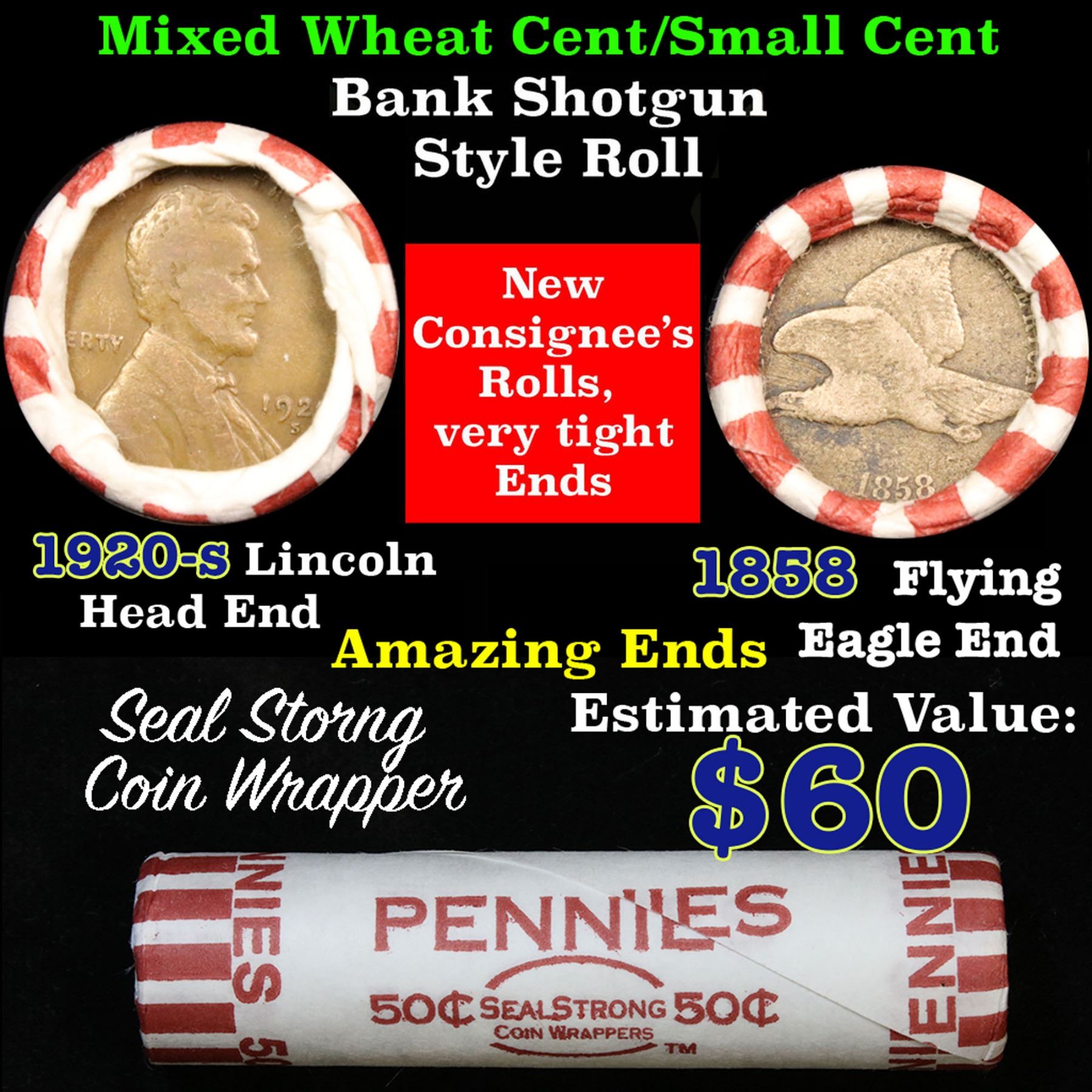 Mixed small cents 1c orig shotgun roll,1920-s Wheat Cent, 1858 Indian Cent other end. The roll is held in an old Seal Strong wrapper. Actual roll pictured is the roll you will get. A great original bank shotgun roll with very tight ends. We have been getting excellent feedback on these rolls. Were being told that close to half the roll are teens, some with mintmarks, there are a few Indians in all the rolls, most of the rolls have steel cents. They seem to be PQ Wheaties rolls. These shotgun rolls are all from a new consignee. They are all frrom one Estate.