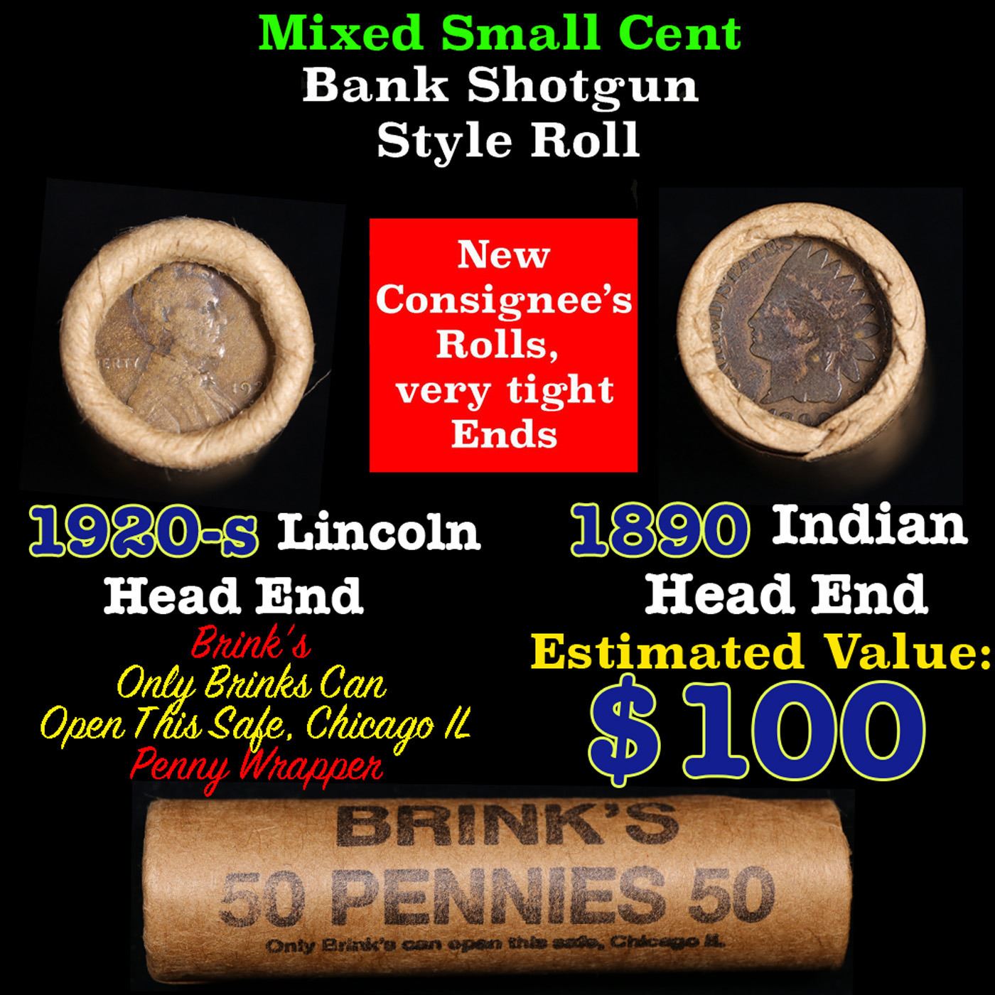 Mixed small cents 1c orig shotgun roll, 1920-s Wheat Cent, 1890 Indian Cent other end, Brinks Wrapper Grades. The roll is held in an old Rare & Collectable Brinks Wrapper. Actual roll pictured is the roll you will get. A great original bank shotgun roll with very tight ends. We have opened a few of these rolls. They seem to be mixed small cents including Indians, Wheats, Steel cents & some Flying Eagles mixed in. These shotgun rolls are all from a new consignee. They are all frrom one Estate.