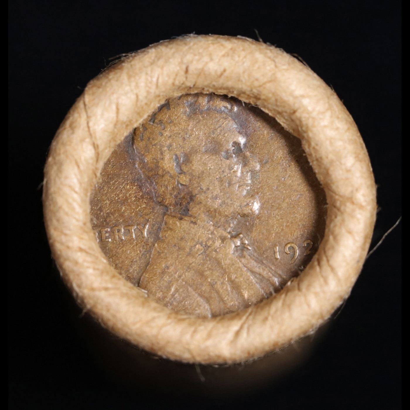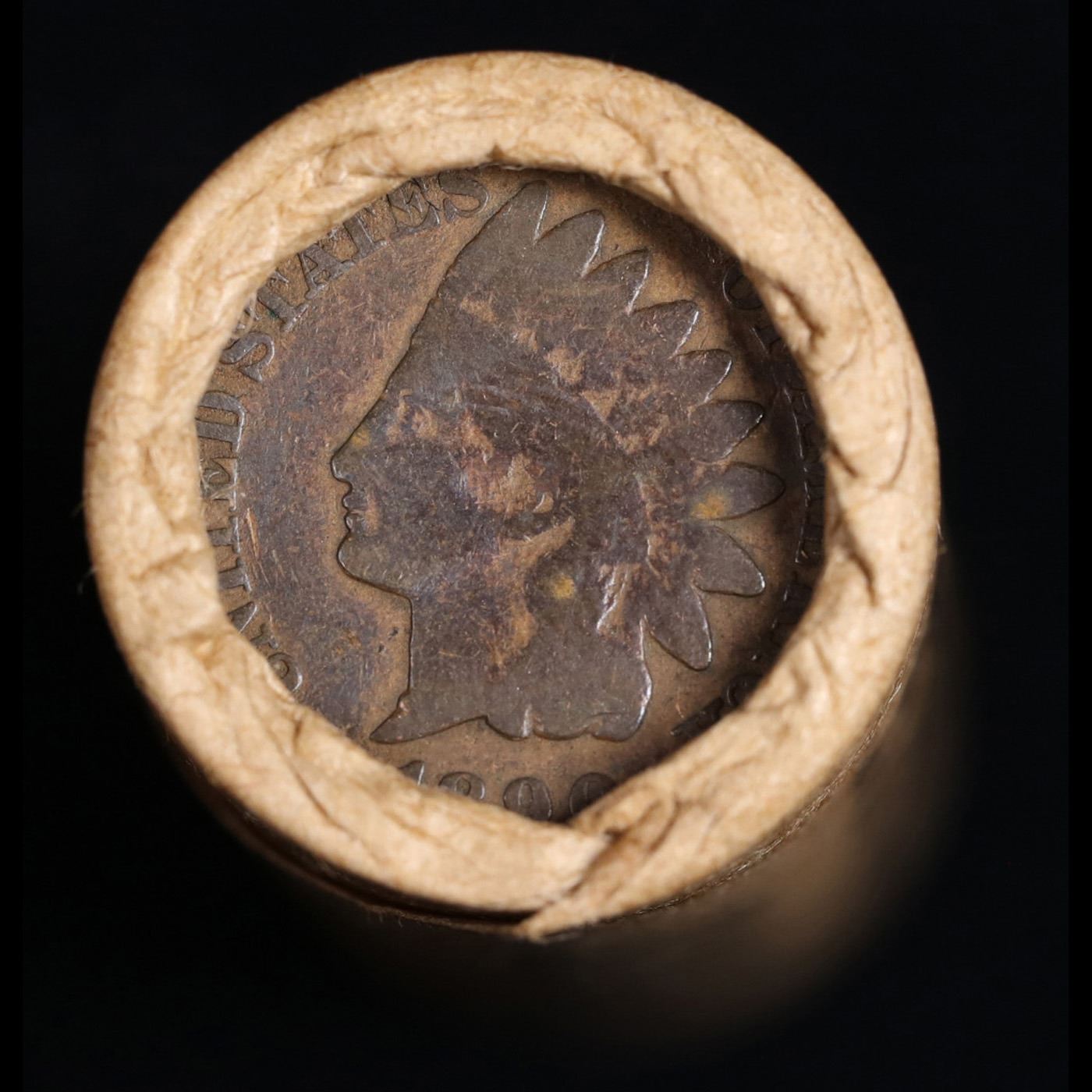 Mixed small cents 1c orig shotgun roll, 1920-s Wheat Cent, 1890 Indian Cent other end, Brinks Wrappe