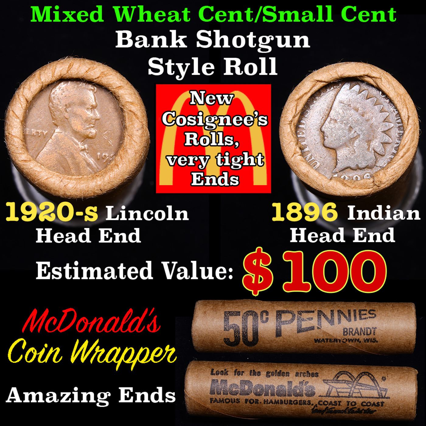 Mixed small cents 1c orig shotgun roll, 1920-s Wheat Cent, 1896 Indian cent other end, McDonalds Wrapper. The roll is held in an old Rare & Collectable McDonalds Wrapper. Look for the Golden Arches. Actual roll pictured is the roll you will get. A great original bank shotgun roll with very tight ends. We have opened a few of these rolls. They seem to be mixed small cents including Indians, Wheats, Steel cents & some Flying Eagles mixed in. These shotgun rolls are all from a new consignee. They are all frrom one Estate.