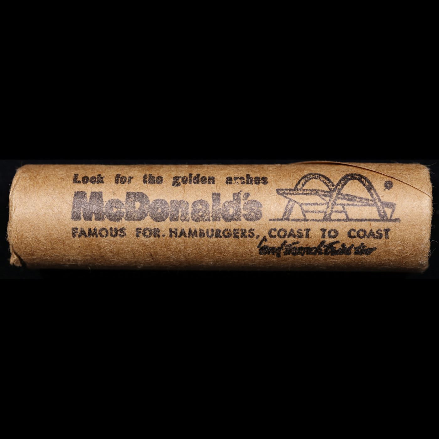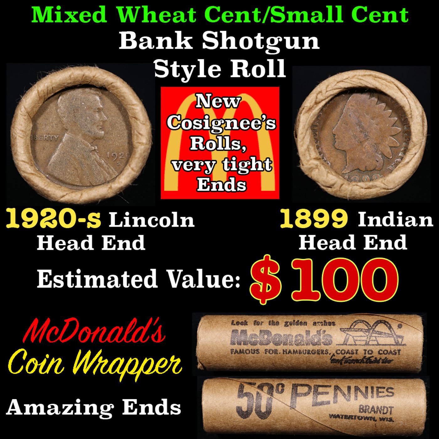 Mixed small cents 1c orig shotgun roll, 1920-s Wheat Cent, 1899 Indian Cent other end, McDonalds Wrapper. The roll is held in an old Rare & Collectable McDonalds Brandt wrapper. Look For The Golden Arches. Actual roll pictured is the roll you will get. A great original bank shotgun roll with very tight ends. We have opened a few of these rolls. They seem to be mixed small cents including Indians, Wheats, Steel cents & some Flying Eagles mixed in. These shotgun rolls are all from a new consignee. They are all frrom one Estate.